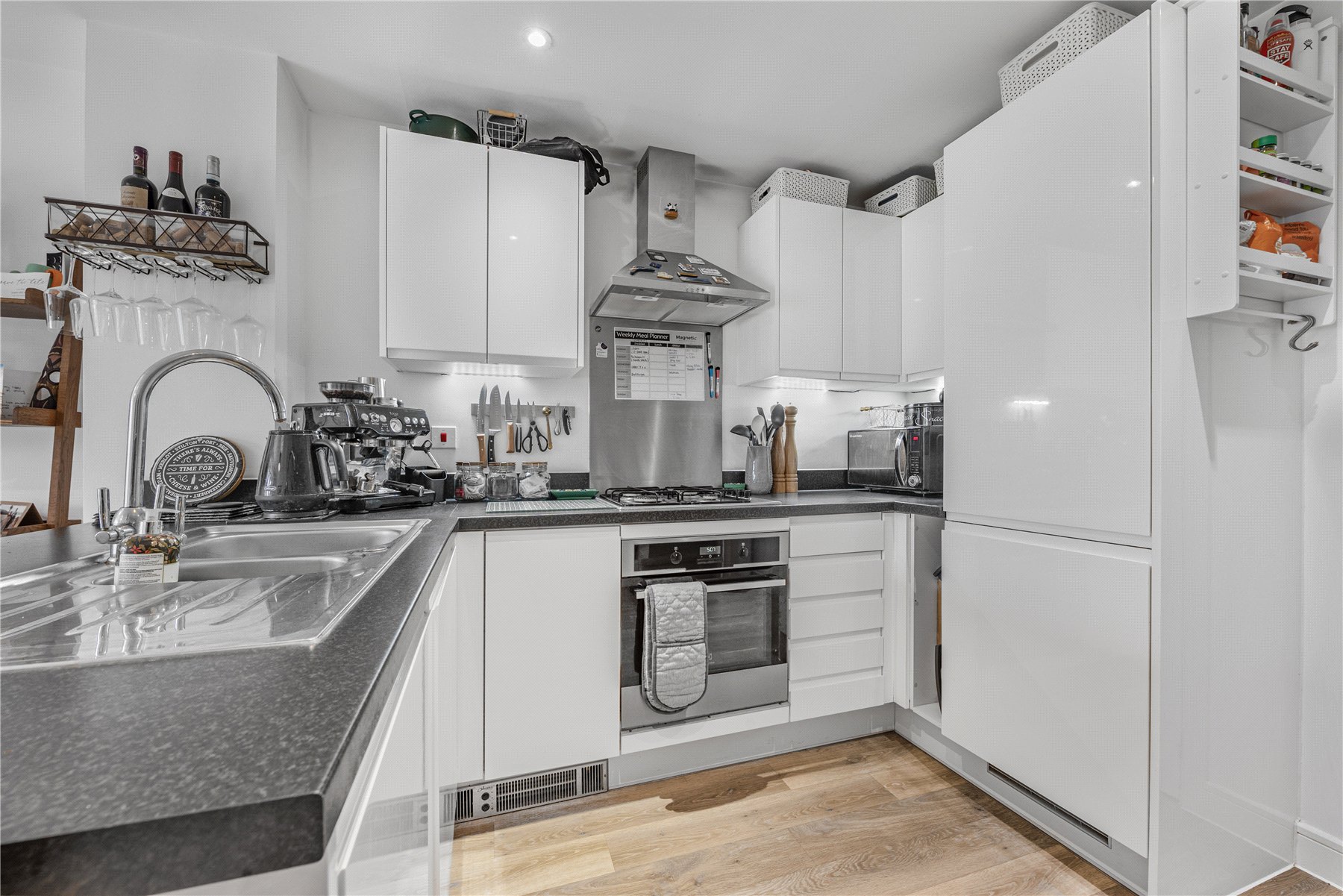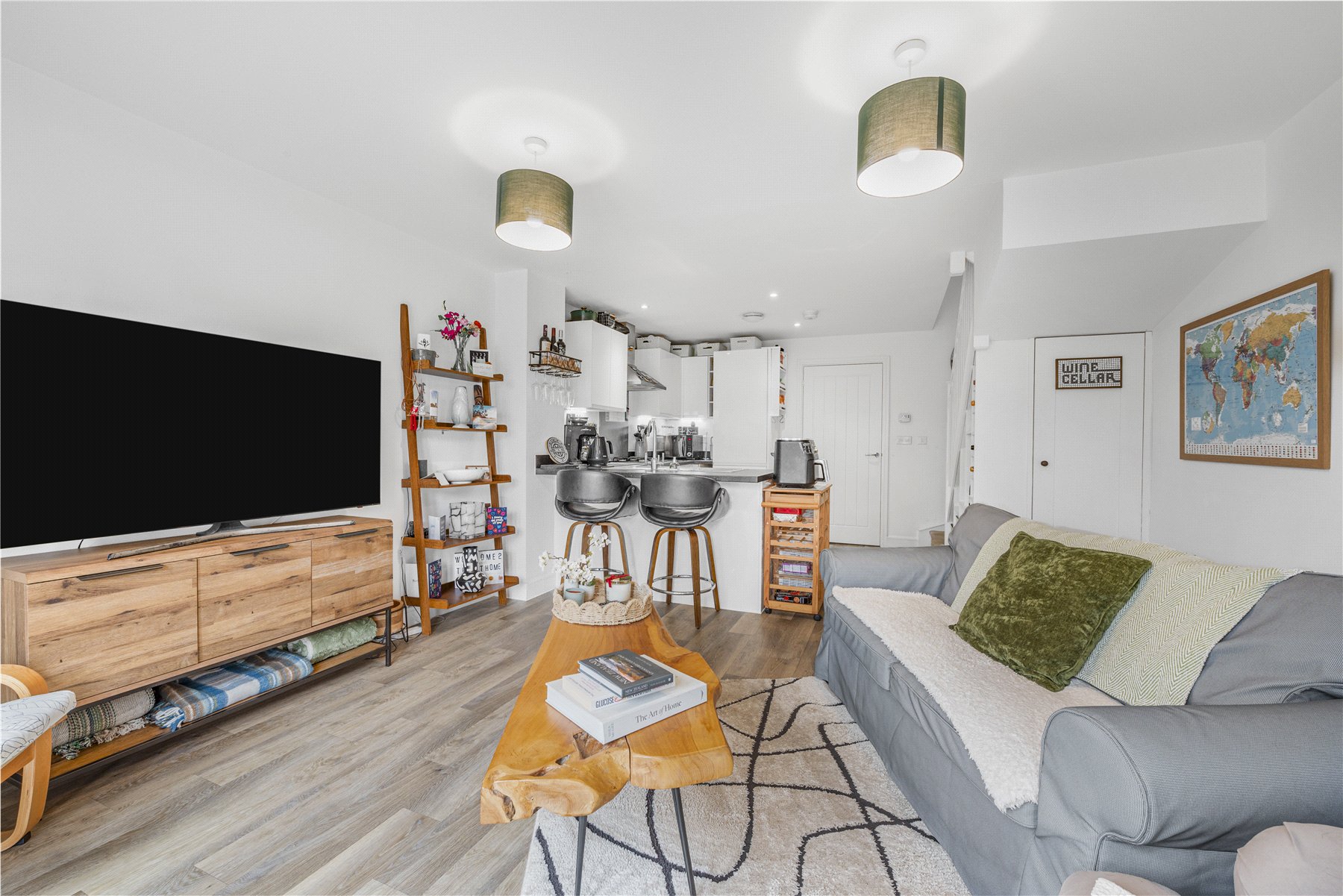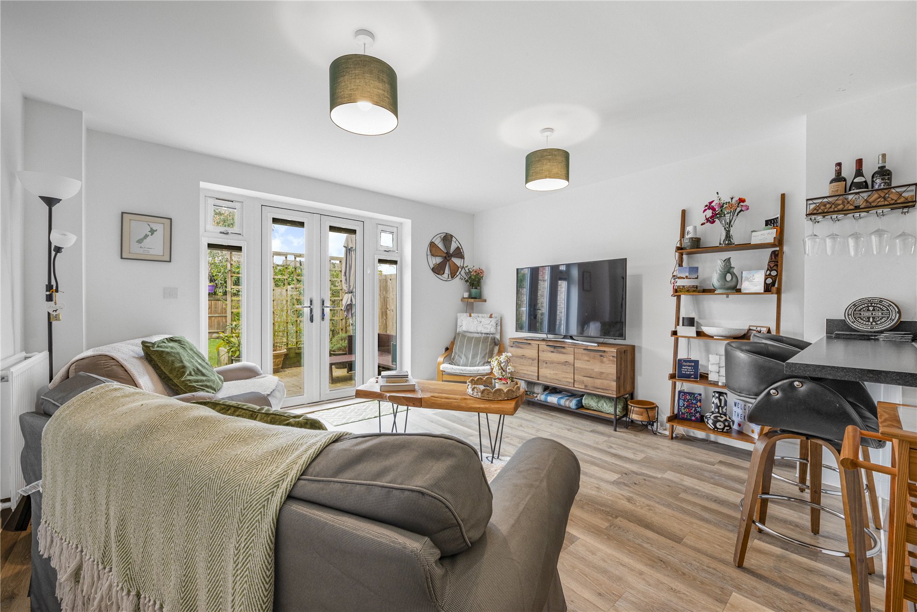 The main living area is open plan, combining the kitchen, living and dining spaces to create a bright and sociable environment. The kitchen is fitted with sleek high gloss base and wall units and includes integrated appliances such as an oven with gas hob, fridge freezer and dishwasher. A breakfast bar provides comfortable seating for two, making it an ideal spot for casual dining. The understairs area has been thoughtfully utilised with bespoke built in shelving and storage units, offering both practical and stylish additional storage. The living area benefits from double doors that open directly onto the rear garden, allowing plenty of natural light and easy access to the outdoor space.