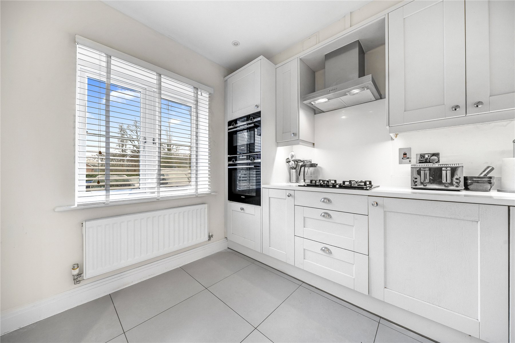 On the ground floor, the front aspect kitchen is fitted with a range of shaker style base and eye level units and includes an integrated double oven, gas hob, fridge/freezer and dishwasher. A convenient downstairs cloakroom adds further practicality. To the rear, a spacious living/dining room provides an excellent living and entertaining space, with doors opening directly onto the rear garden.