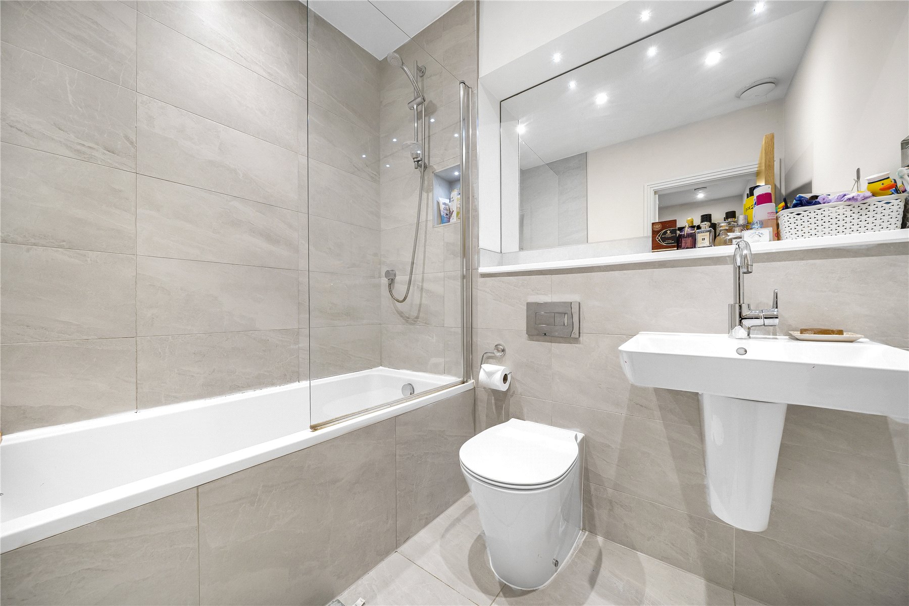 The property features two generous double bedrooms, with the principal bedroom benefiting from built-in wardrobes. Both bedrooms are served by a contemporary family bathroom fitted with a three piece suite comprising a wash hand basin, W.C. and bath with wall mounted shower and glass shower screen. Stylish floor to ceiling tiling completes this modern space.