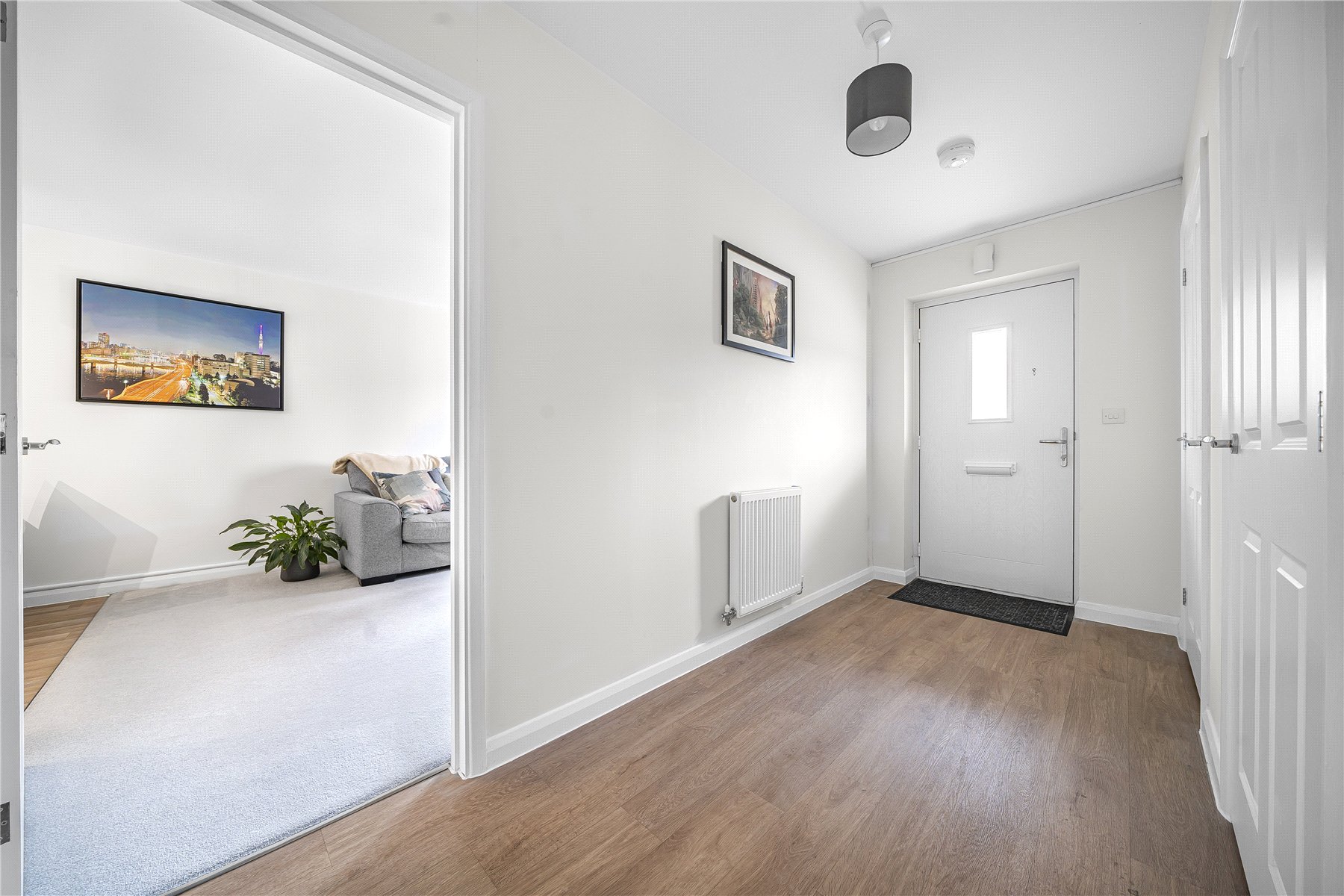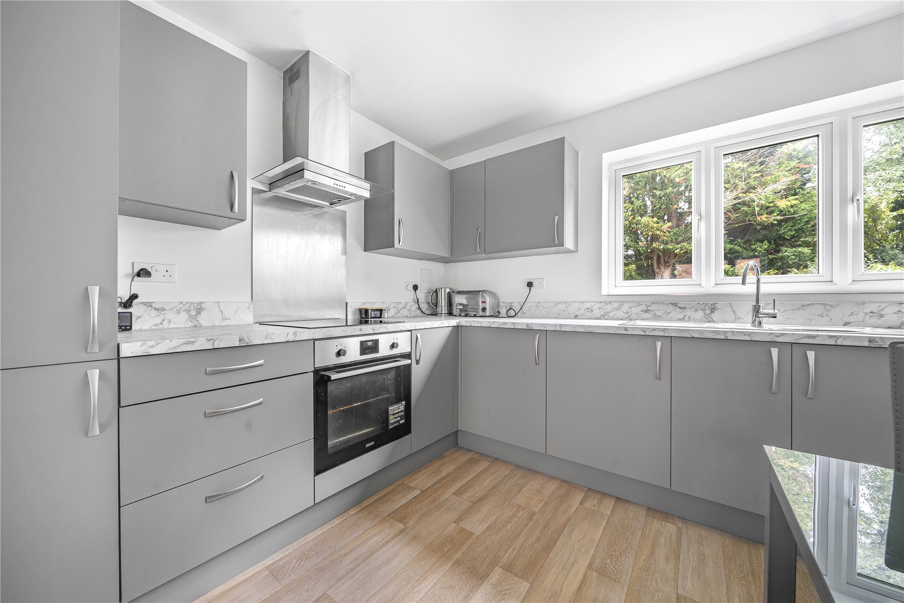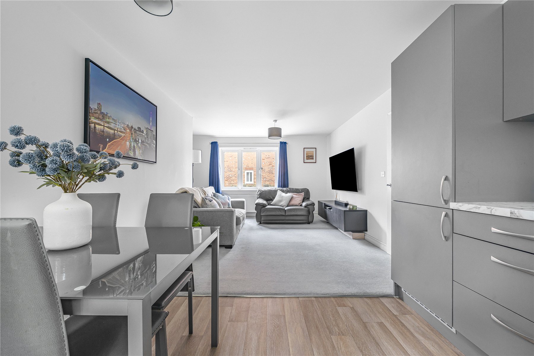 At the heart of the home is a light and airy open-plan living space, seamlessly combining the lounge, dining and kitchen areas. The modern kitchen is well equipped with a range of base and eye level units, an integrated oven and electric hob and a built-in fridge freezer, making it both stylish and practical.