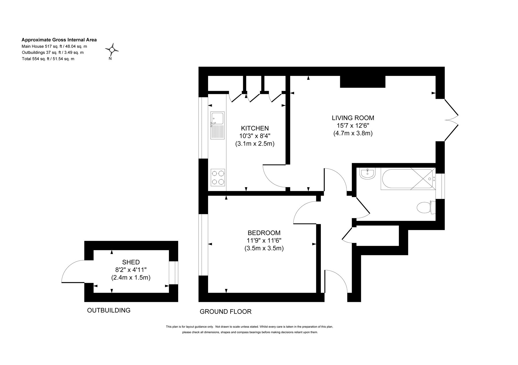 The accommodation comprises a large double bedroom, a well-proportioned lounge with doors leading out to a courtyard garden, a separate kitchen, and a bathroom. Outside, there is the added benefit of a brick-built storage shed.