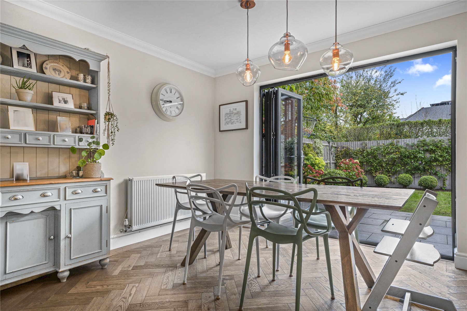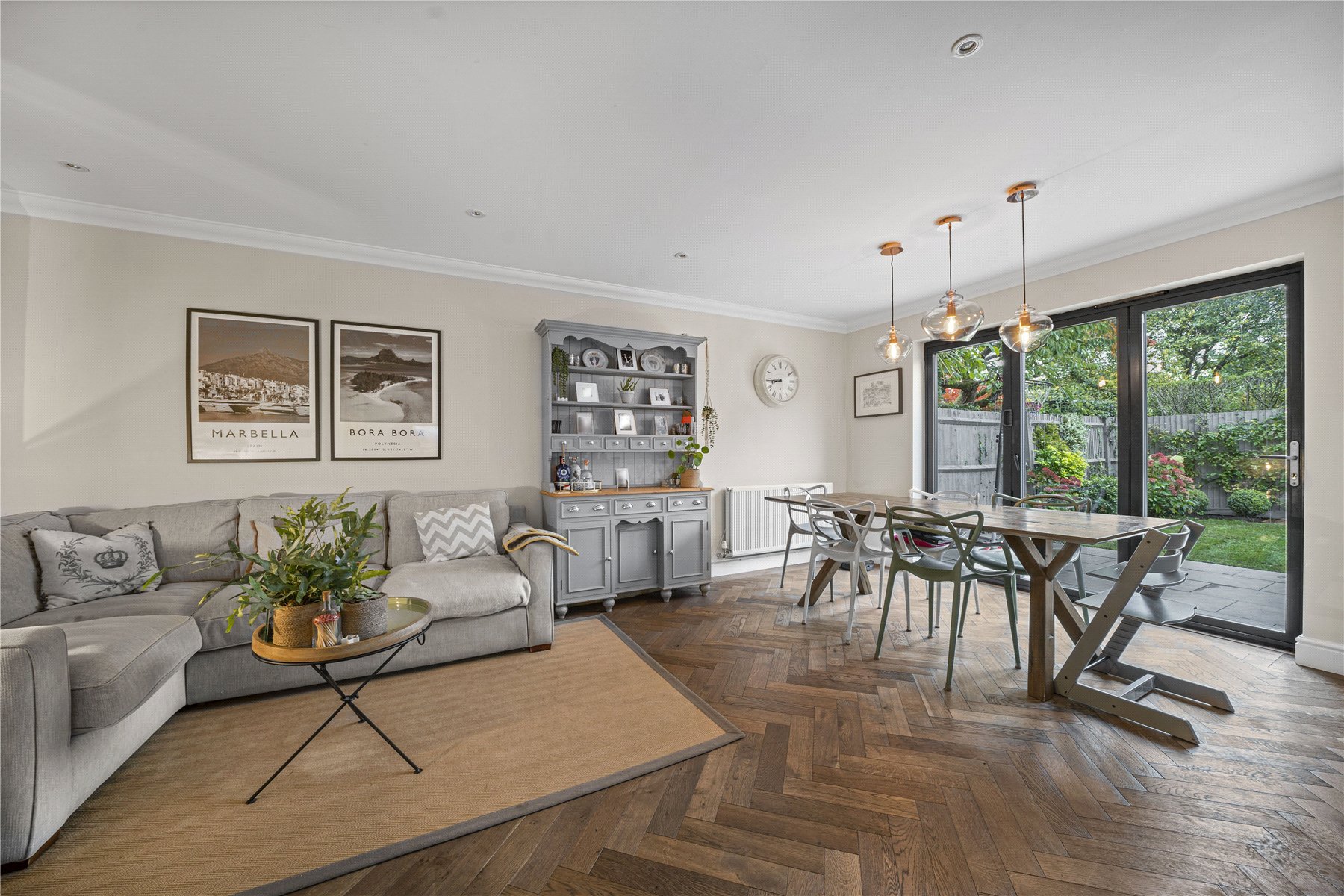The ground floor has been transformed into a stunning open-plan kitchen/dining/living area, positioned to the rear of the home and flooded with natural light. The kitchen is fitted with an extensive range of both base and eye-level units, complemented by granite worktops, a central island with breakfast bar seating, and space for a range cooker. Bi-folding doors open out to the rear garden, while herringbone flooring flows throughout this sociable space.