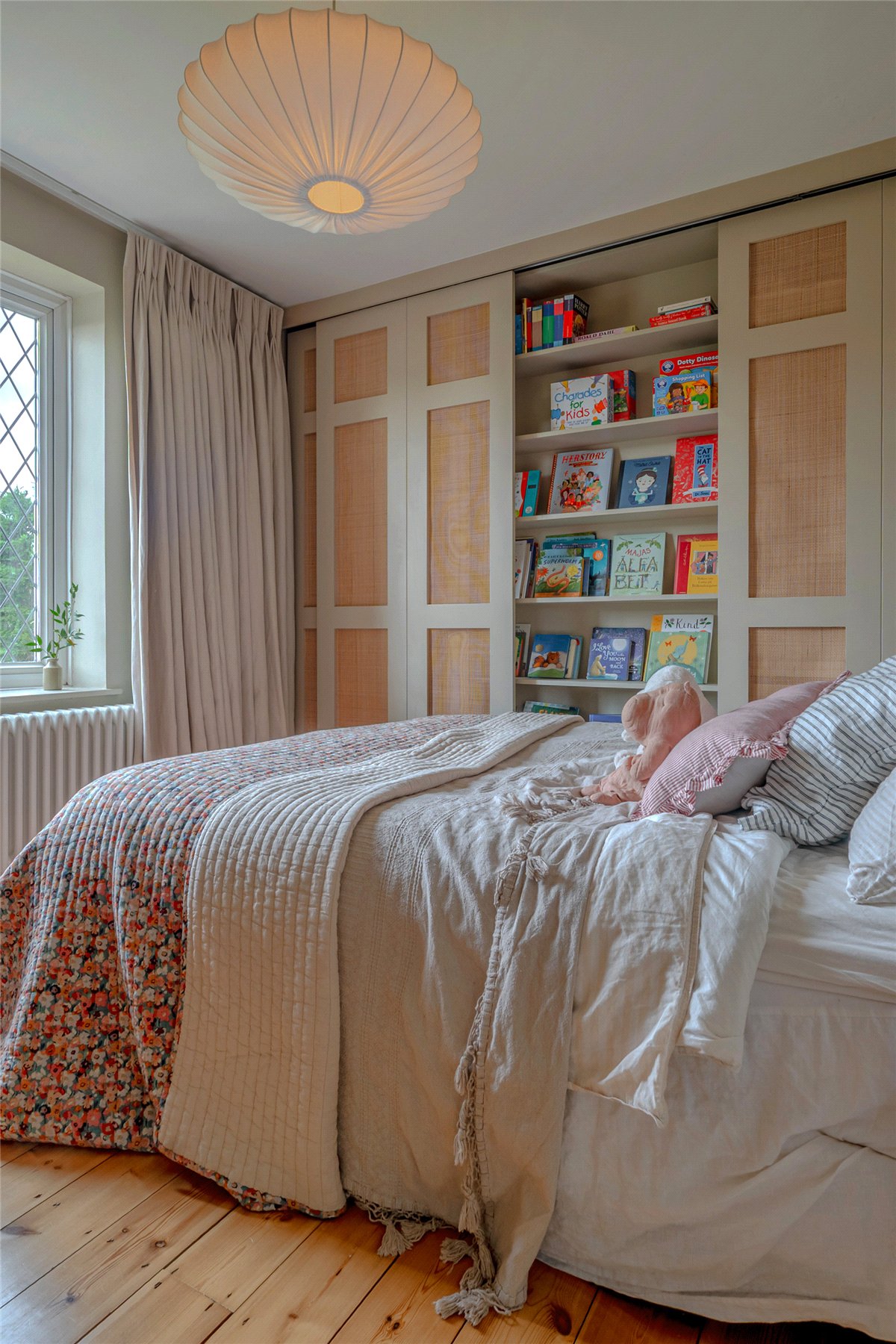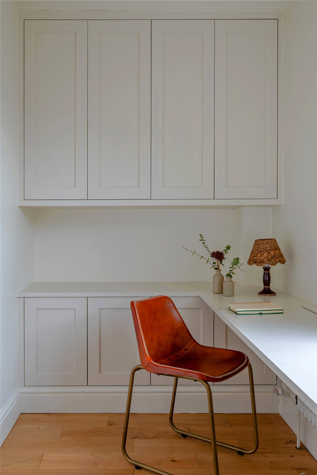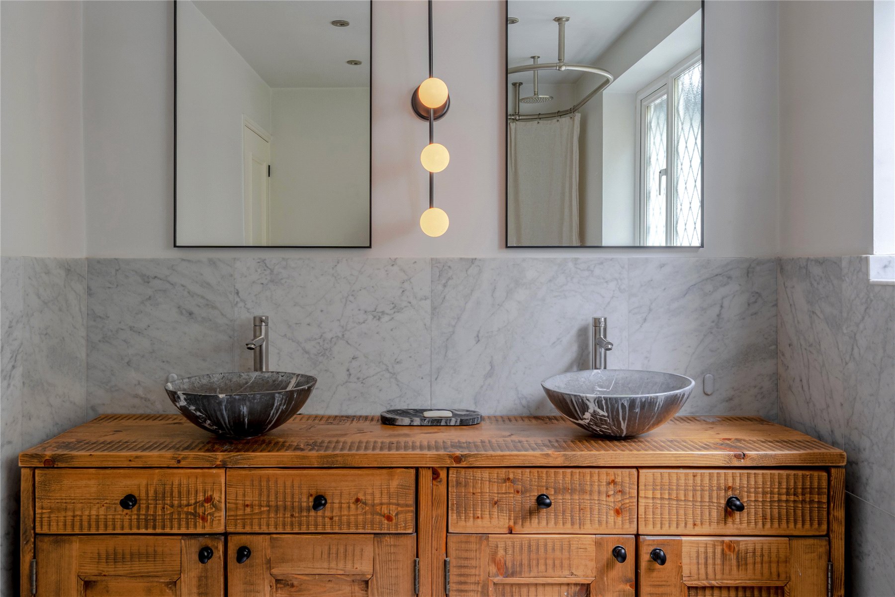 Upstairs, there are four well-proportioned bedrooms and two bathrooms. The principal suite, along with the additional bedrooms, benefits from bespoke wardrobes and ample fitted storage, while one of the bathrooms has been luxuriously refurbished to a high standard.