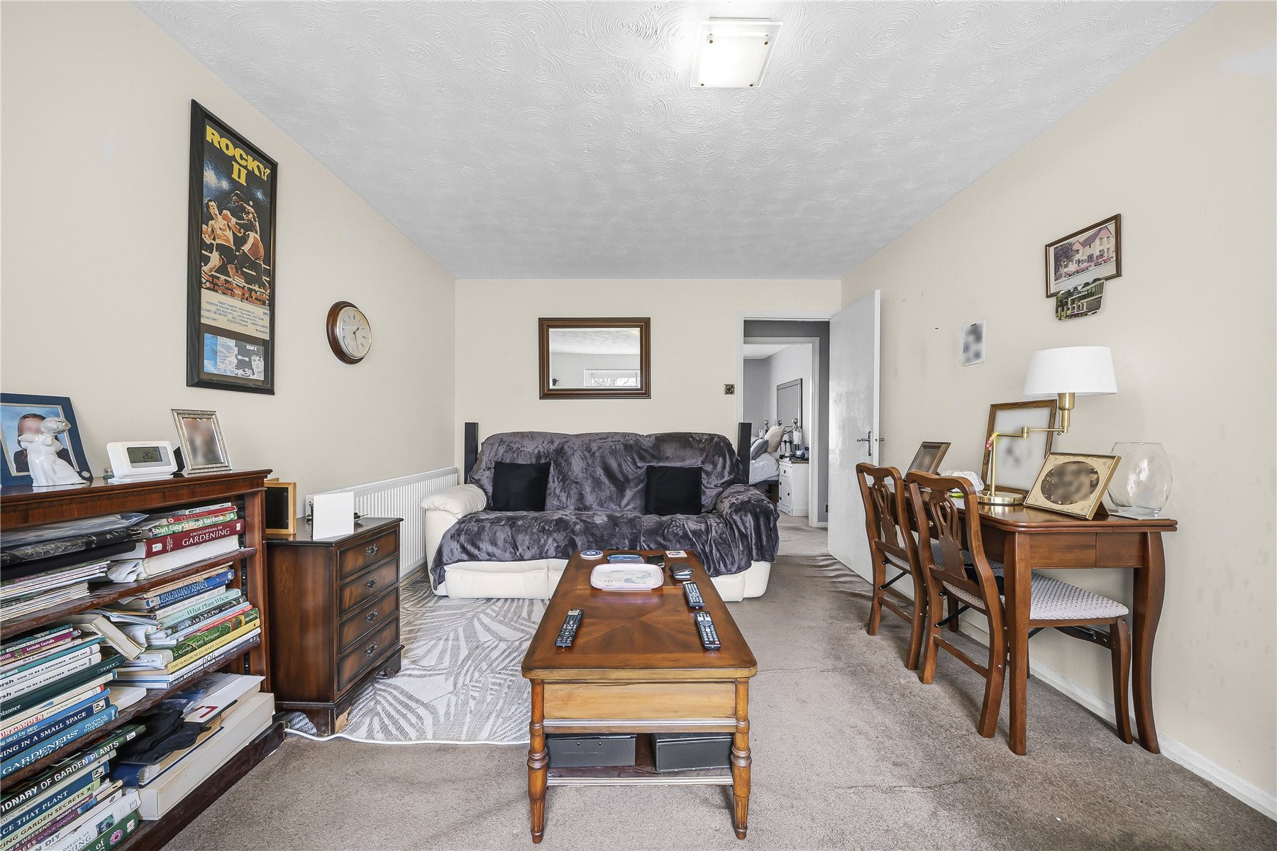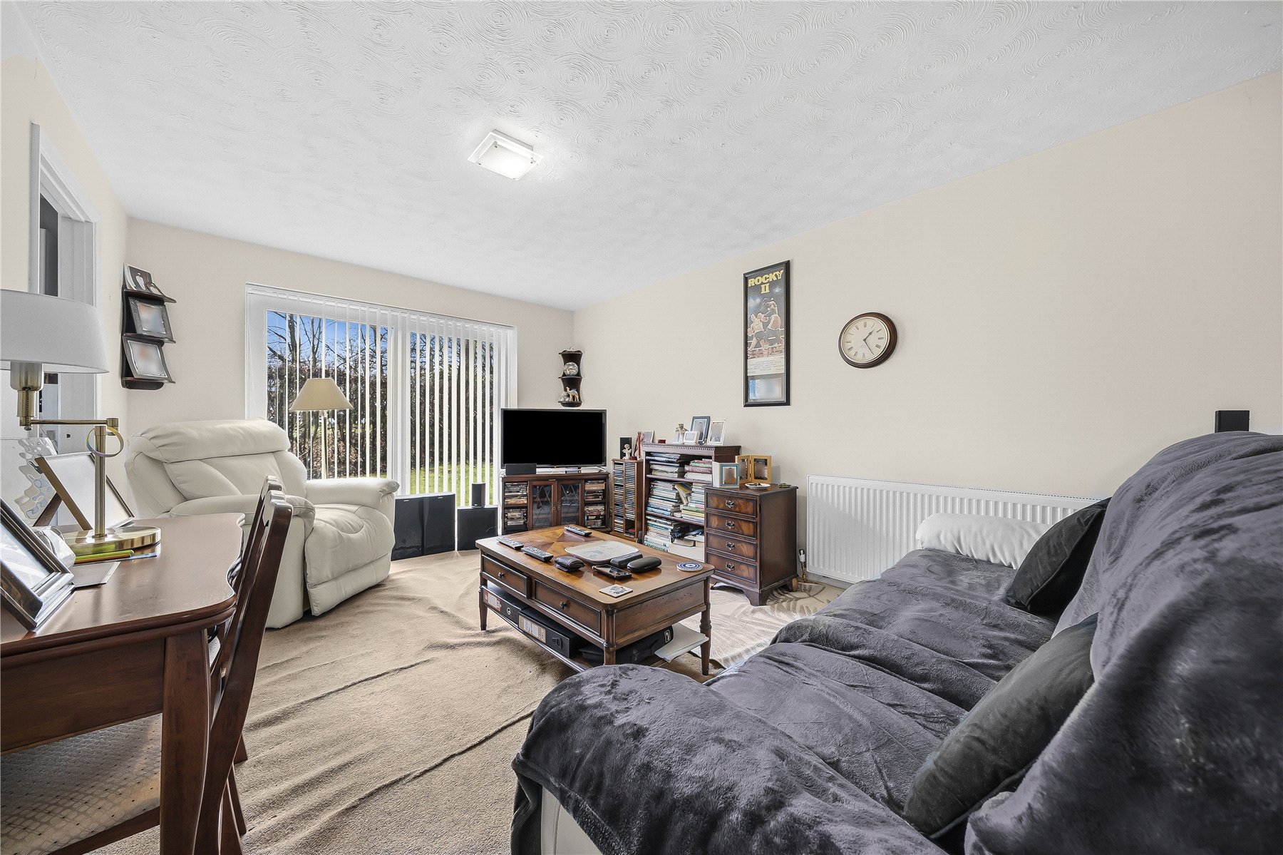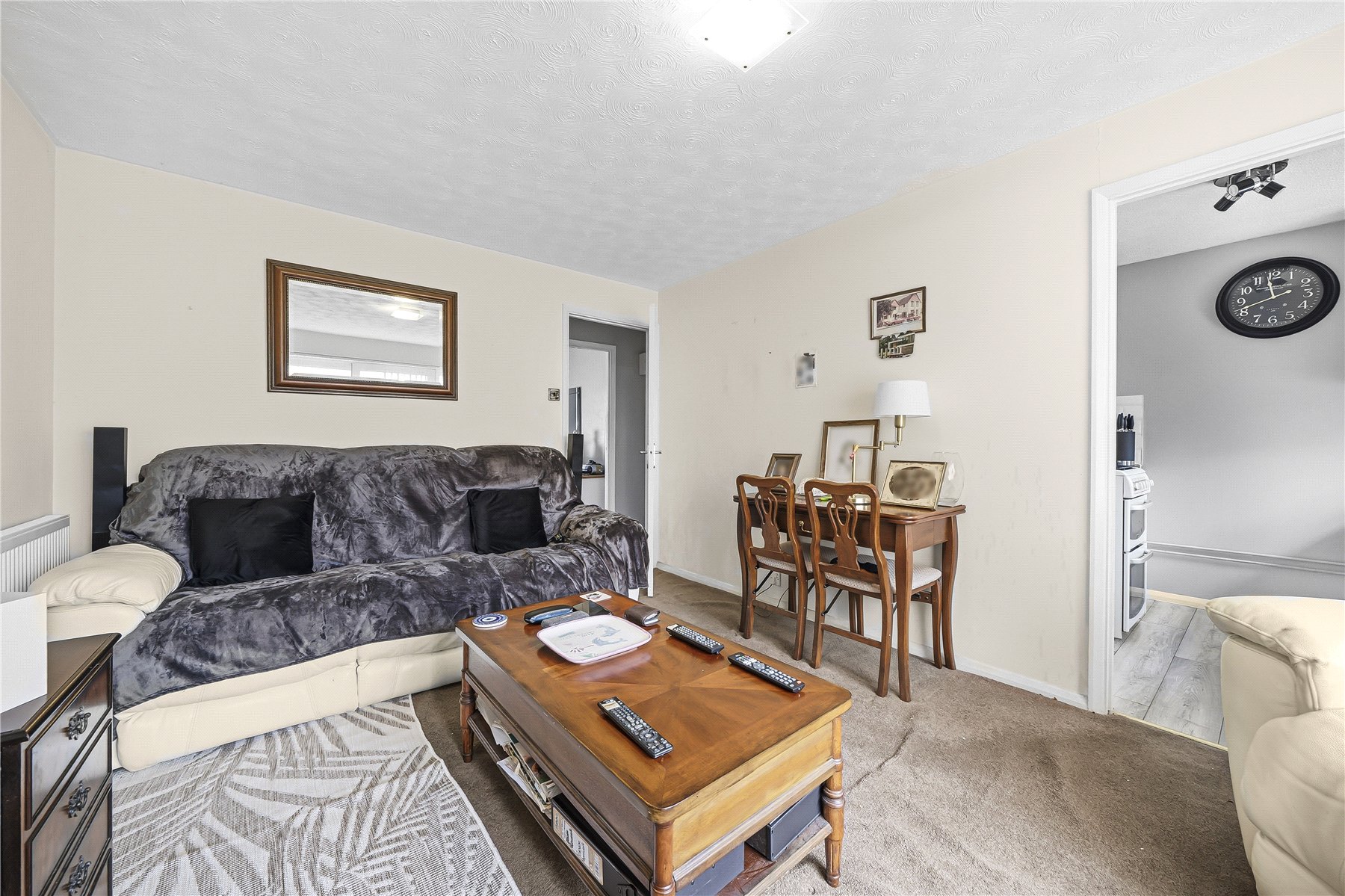 The spacious lounge/dining room offers a bright and welcoming living space, with a door leading directly out to the communal garden, ideal for relaxing or enjoying outdoor space.