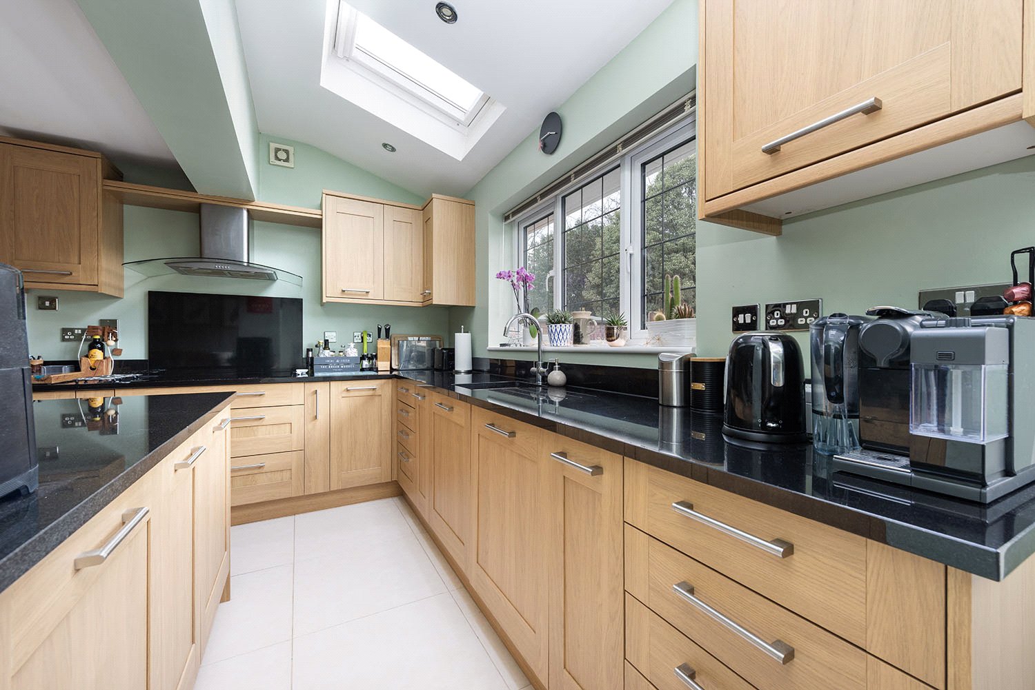 At the rear of the property is the beating heart of the home, a stunning open plan kitchen with a pitched roof creating the feeling of space and Velux windows that allow for plenty of natural light. The kitchen has been fitted with an extensive range of base and eye level shaker style units, that are complimented by black granite worktops, and a large island providing further worksurface space. Adjoining is a utility room and a downstairs cloakroom completes the ground floor.