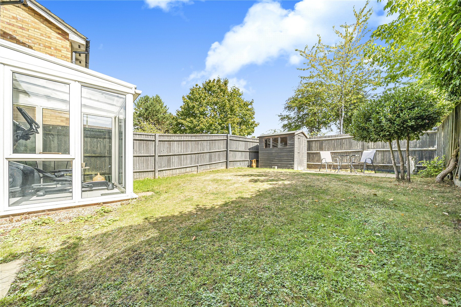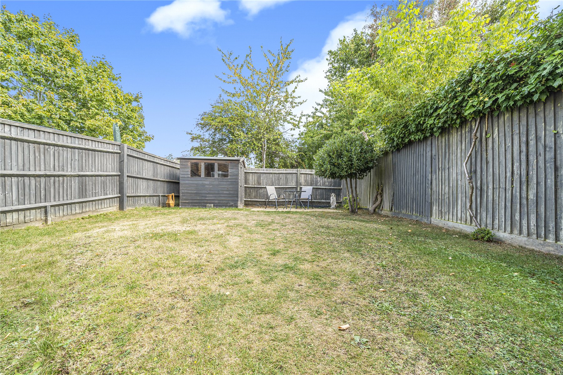 The rear garden is predominantly lawned with a sun terrace to the rear as well as a timber shed. Side access leads to the front which is open plan in style and provides off road parking via a driveway which gives access to a single garage with power, light, and also plumbing for a washing machine.