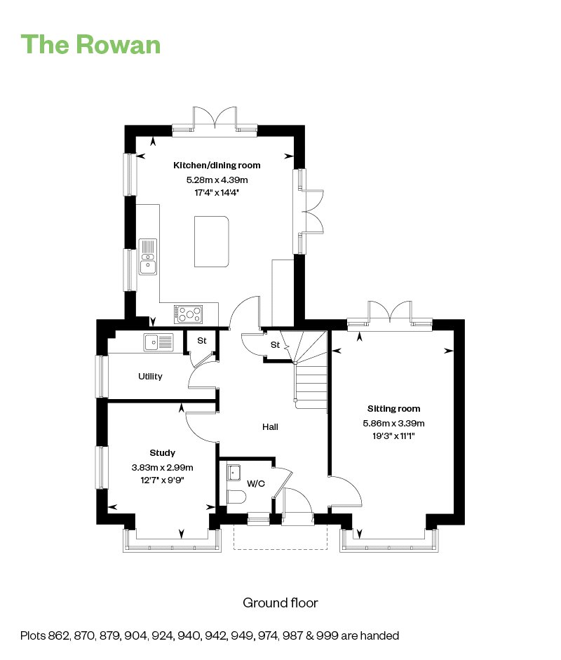 From the moment you step into the expansive central hallway, the sense of scale and light is immediate. This detached property has been crafted to offer a seamless flow between its social hubs and private retreats, ensuring every family member has a space to call their own.The heart of the home is undoubtedly the dual-aspect kitchen and dining room located at the rear. This impressive space is anchored by a central island, making it as much a social gallery as a culinary workspace. With two sets of French doors opening out to the garden, the room is bathed in natural light, creating an effortless transition for indoor-outdoor entertaining. Whether you're hosting a formal dinner or a busy family breakfast, the layout is designed to handle the demands of a modern lifestyle with ease.For more relaxed evenings, the dual-aspect sitting room provides a generous and comfortable environment. Like the kitchen, it features its own set of French doors, ensuring the home feels connected to the outdoors from every angle. Practicality is also a priority on the ground floor, which includes a dedicated study for those working from home, a separate utility room to keep laundry out of sight, and a guest W/C tucked neatly off the hall.Moving upstairs, the first floor continues to impress with four well-proportioned bedrooms. The primary suite is a true sanctuary, spanning over seventeen feet in length and featuring a private en-suite and built-in wardrobes. Not to be outdone, the second bedroom also boasts its own en-suite, making it an ideal guest suite or a premium room for an older child. The final two bedrooms are served by a stylish family bathroom, providing plenty of flexibility for a growing family or those needing extra hobby space.The Rowan is a home that doesn't just look beautiful on a plan; its designed to work beautifully in reality. With its clever storage solutions, multiple en-suites, and bright, airy living spaces, it represents the very best in new-build craftsmanship. It is a house ready to be turned into a home.