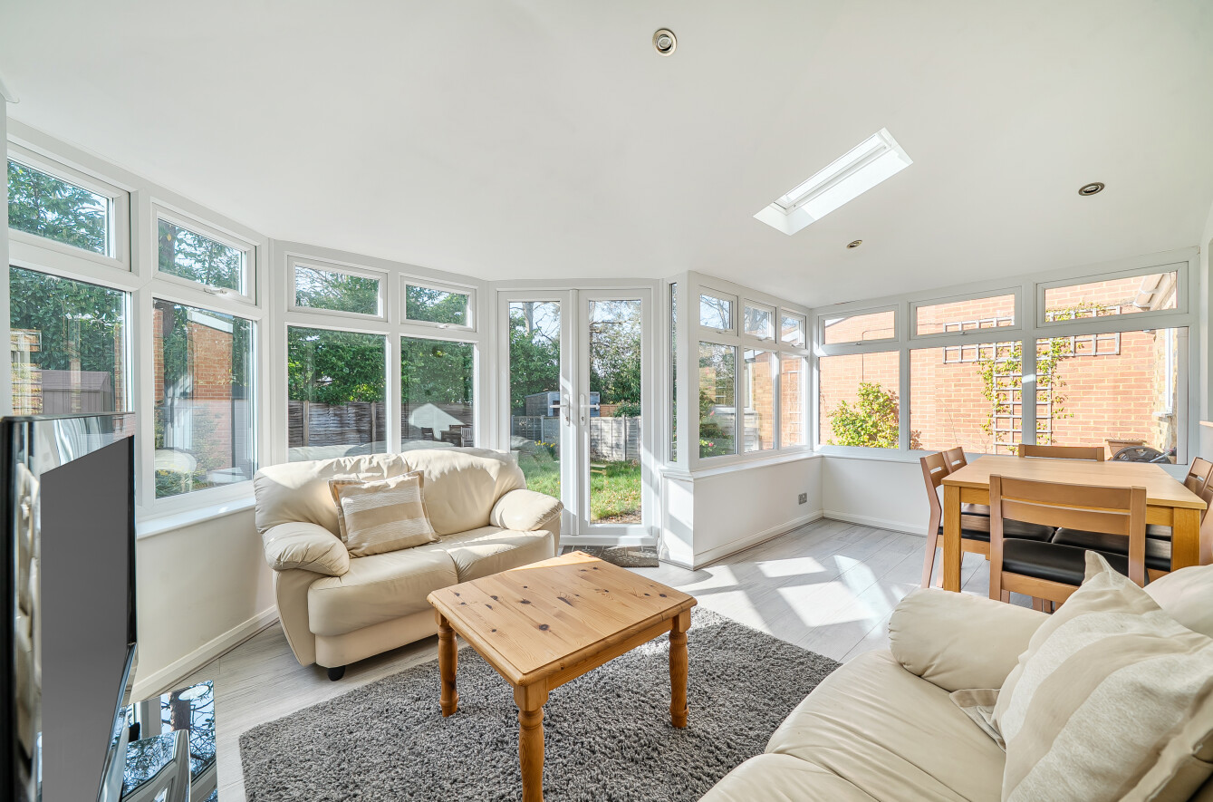 Spanning the full width of the rear is a substantial conservatory. Unlike many, this one benefits from excellent insulation, a solid roof, and double glazing, creating a versatile additional living space ideal for both dining and relaxing. French doors open directly onto the spacious rear garden, with access to the garage also available. At the front of the property, the formal living room is bright and airy, offering ample space for multiple sofas and family gatherings.