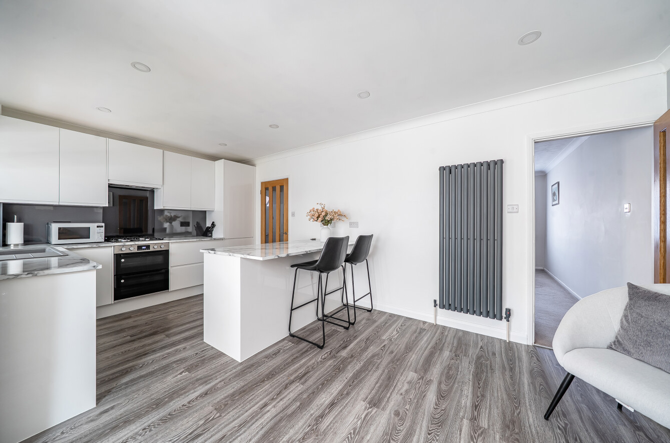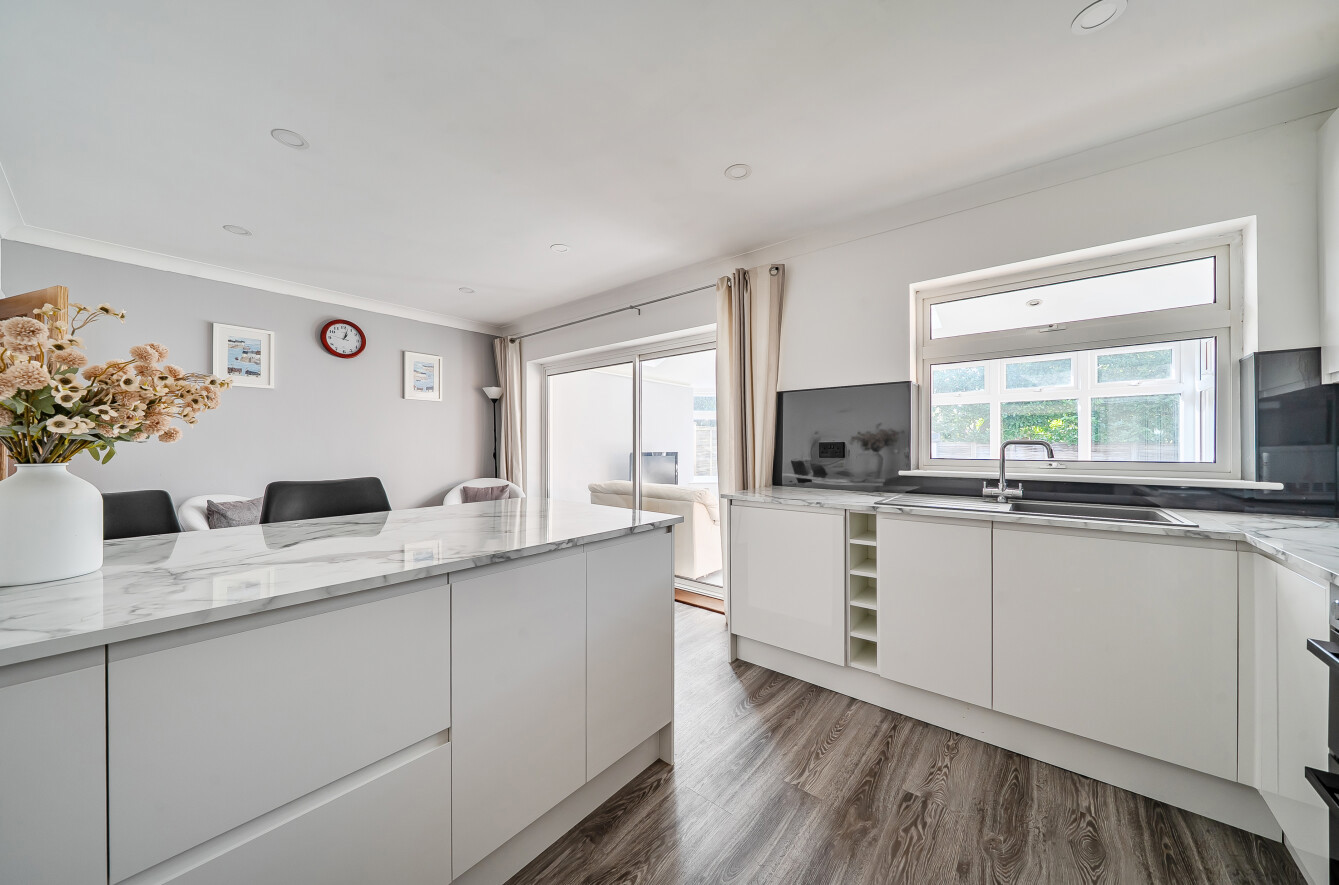 The welcoming entrance hall offers plenty of room for coats and shoes, with a convenient downstairs WC located straight ahead. To the right, the open-plan kitchen/dining room features sleek white cabinetry, marble-effect worktops, and integrated appliances, a clear reflection of how beautifully maintained the home is.
