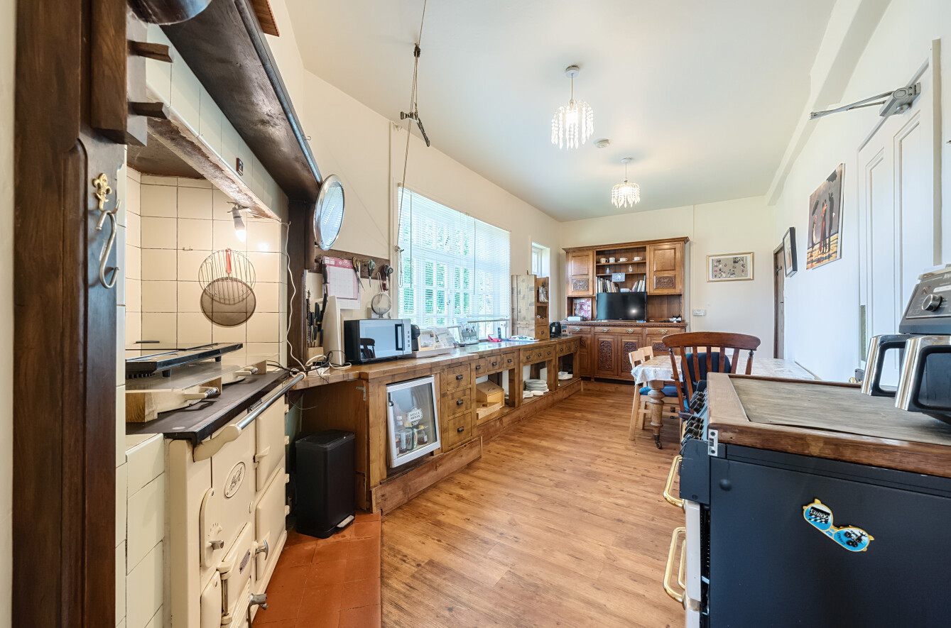 As you walk in through the gate, down the courtesy path and through the front door you are welcomed into a charming entrance hall. To the left you'll find the dining room with stunning wooden floors and a log burning fireplace. You will find access through to the kitchen which is very spacious, boasting an Aga, pantry and a utility room just off of it.