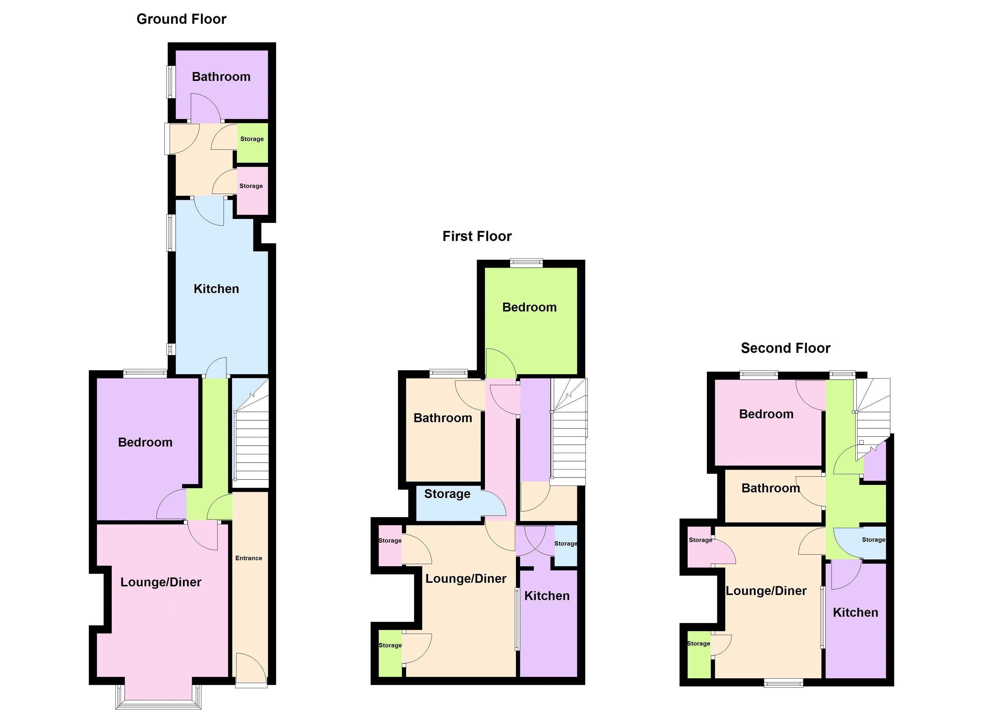 Front door to Flat 1 opens to hallway, giving access to Lounge / Diner (4.98m x 3.19m), Bedroom (3.57m x 2.72m) and Kitchen (4.45m x 2.38m). Door from kitchen leads through to rear access area, opening up to Bathroom (1.76m x 2.26m).