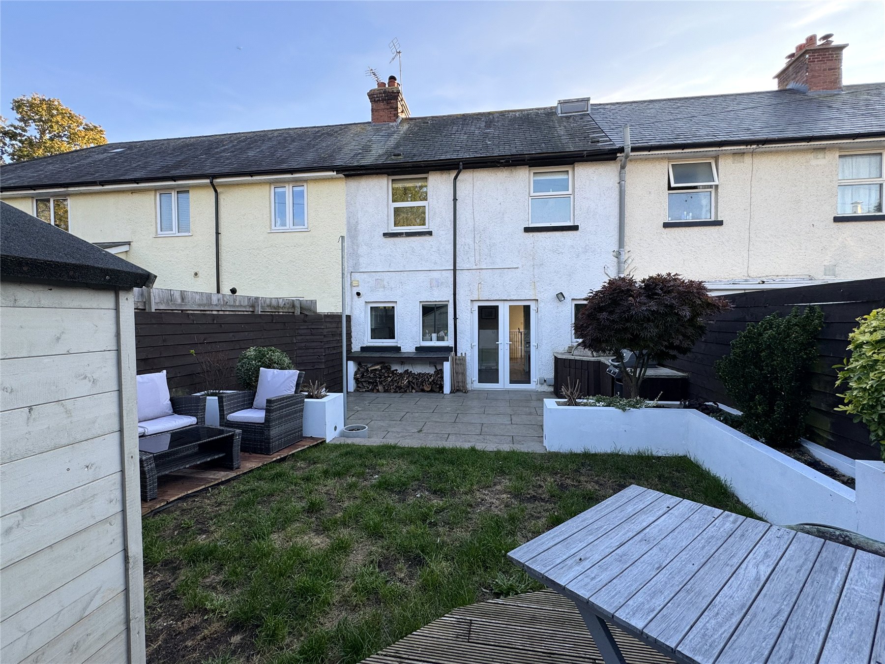 Outside and to the rear, the gardens are low-maintenance and ideal for entertaining or simply relaxing. A good-sized, level terrace adjoins the house with a built in 'garden kitchen' with pizza oven and space for a large barbeque along with a practical log store. Stepping up to a level lawn, complemented by raised flower beds and decked terrace beyond plus a large shed, and gate providing useful rear access.