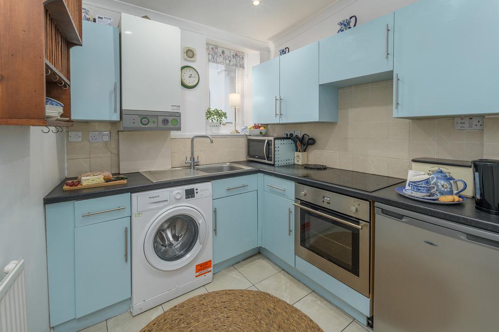 The country cottage style kitchen overlooks the rear of the property and offers a good number of wall and base units with a blue-coloured door complemented by a contrasting black work surface and cream-coloured splash back tiling. There is space for an electric cooker and hob, a free-standing fridge freezer and space for a washer-dryer.