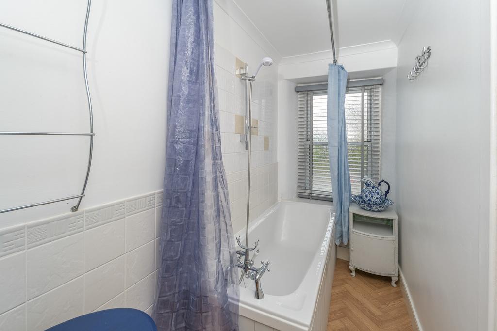 The bathroom comprises a close coupled toilet with a push button behind, a hand wash basin and a bath with a shower over. The space is finished with cream coloured tiling.