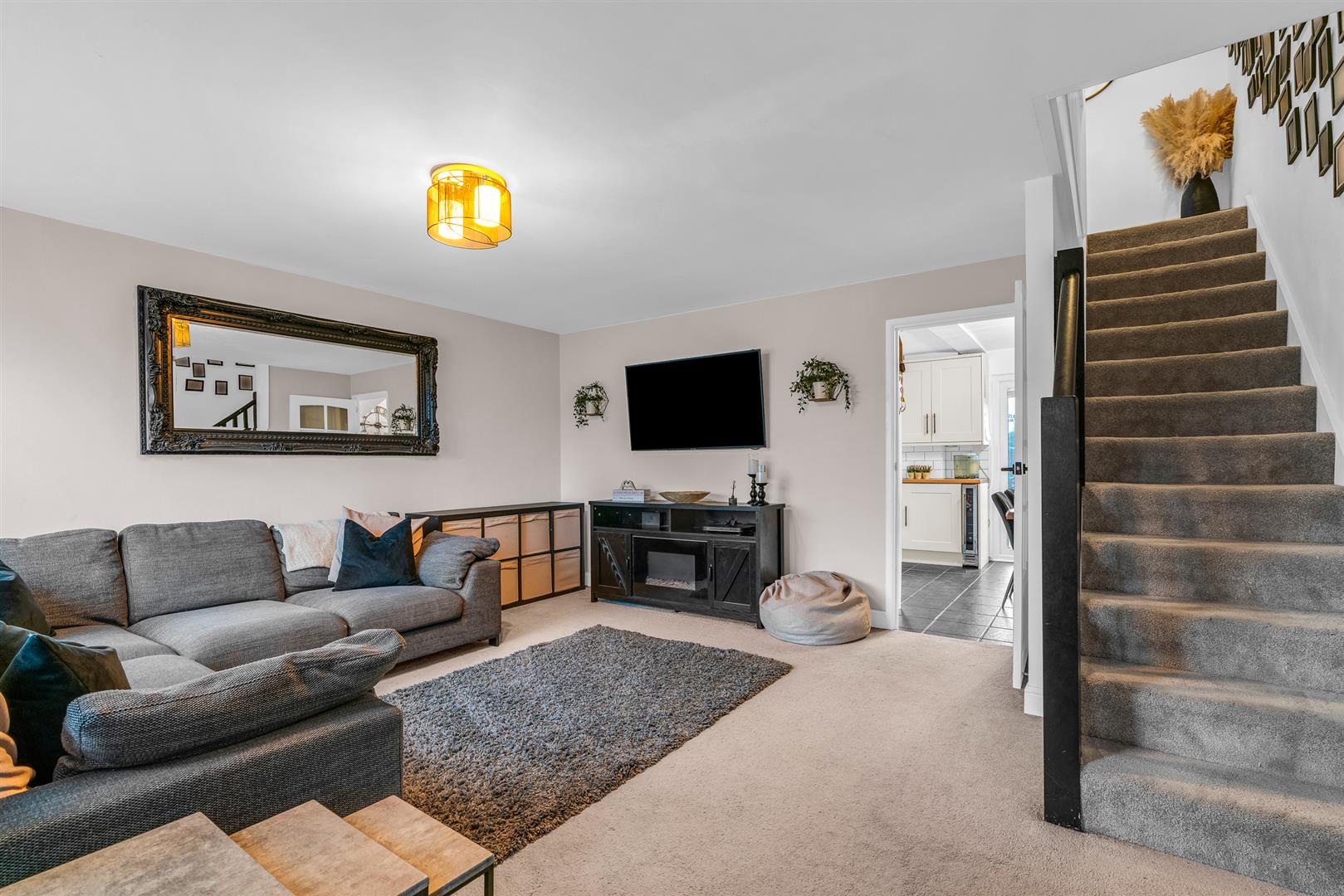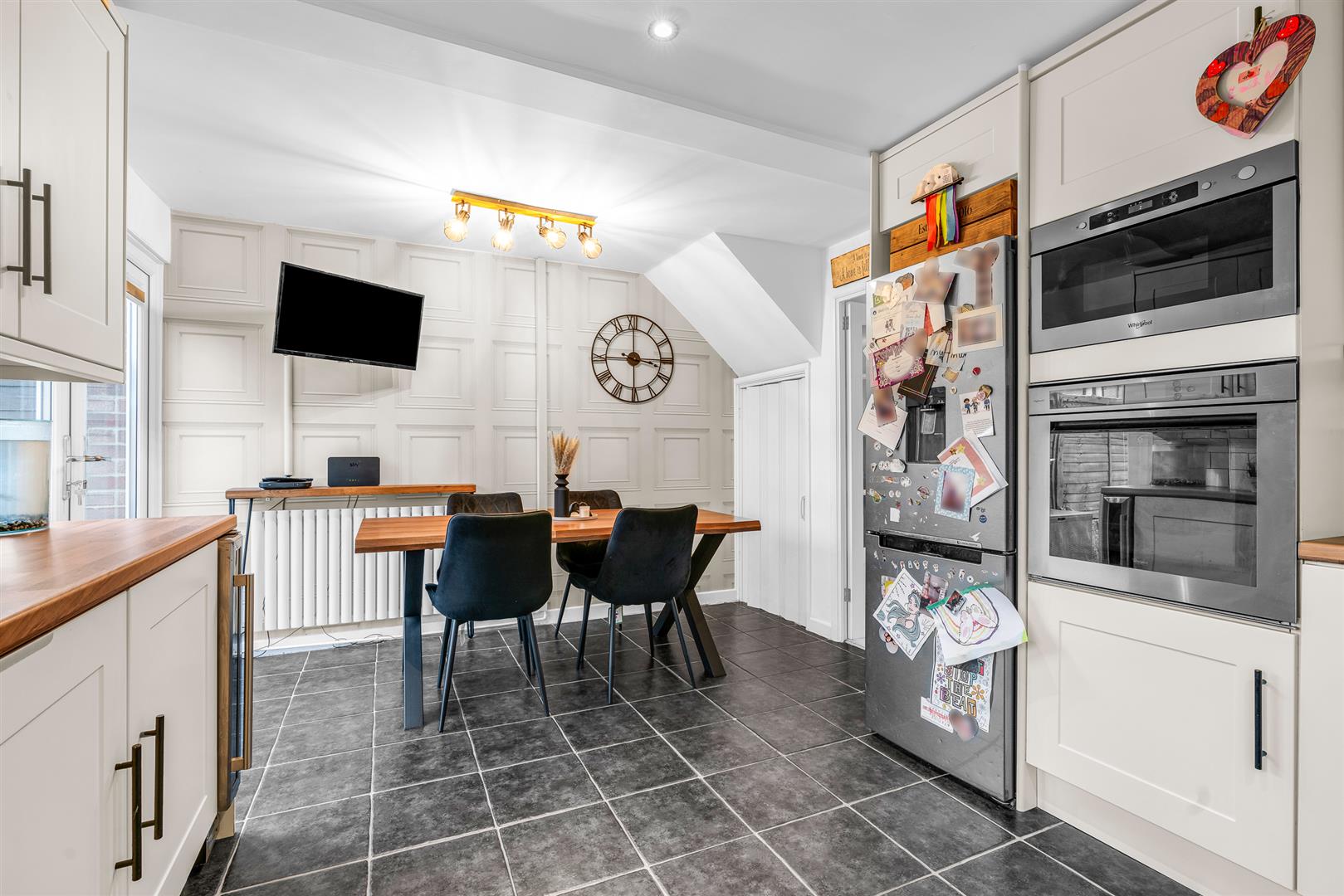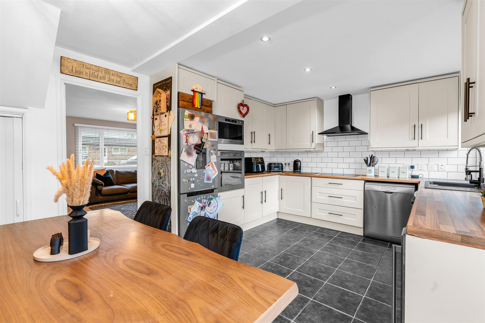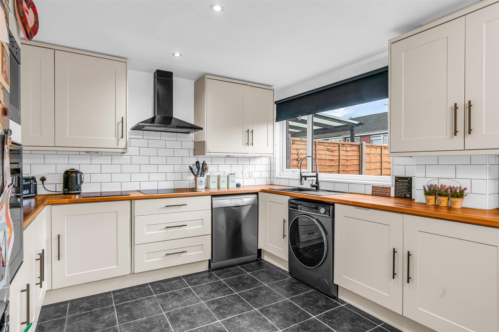 Kitchen/Diner - Double-glazed window to the rear, tiled flooring, and a built-in Whirlpool double oven, electric hob with stylish black extractor fan. Part-tiled walls, black resin sink and drainer with swan-neck mixer tap, and laminate wood-effect worktops. Plumbing for both washing machine and dishwasher, under-counter lighting, and inset ceiling spotlights. Built-in cupboard housing the consumer unit and electric meter, plus an understairs storage cupboard.