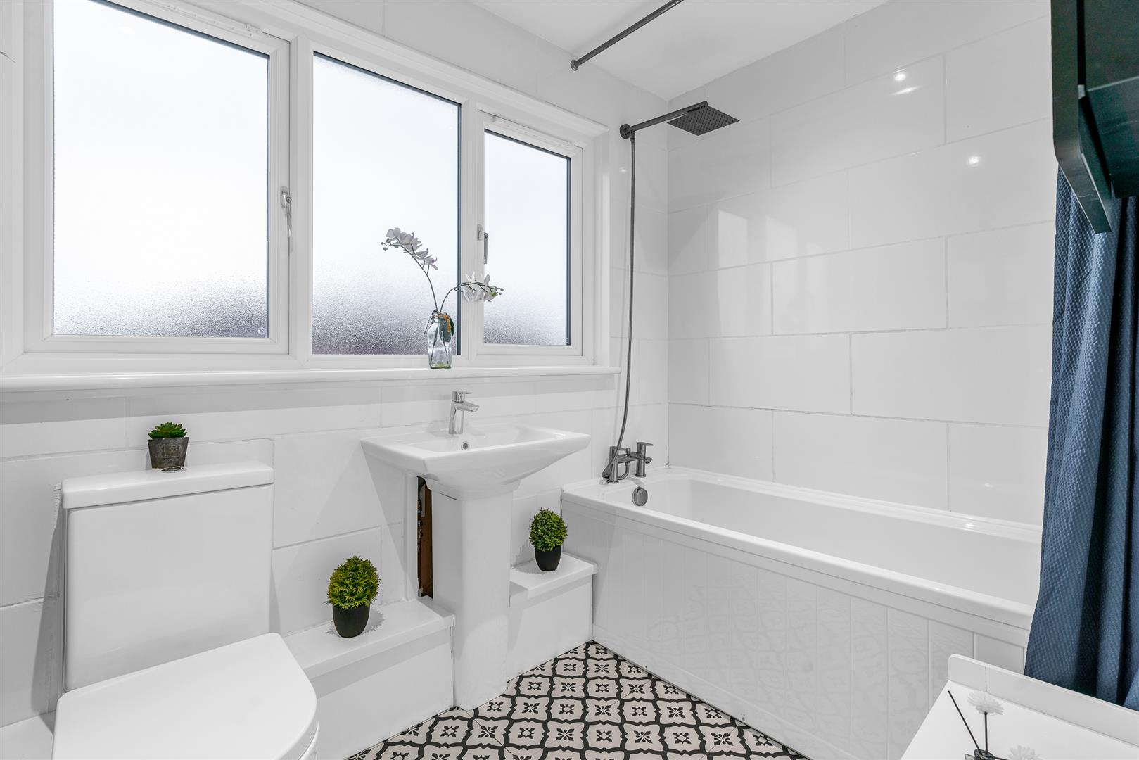 Bathroom - Opaque double-glazed window to rear, mosaic vinyl flooring, radiator, low-level WC with push flush, pedestal wash hand basin with mixer tap, white panelled bath with overhead rainfall shower, tiled walls, mirrored vanity cabinet with steam-free feature, and inset ceiling spotlights.