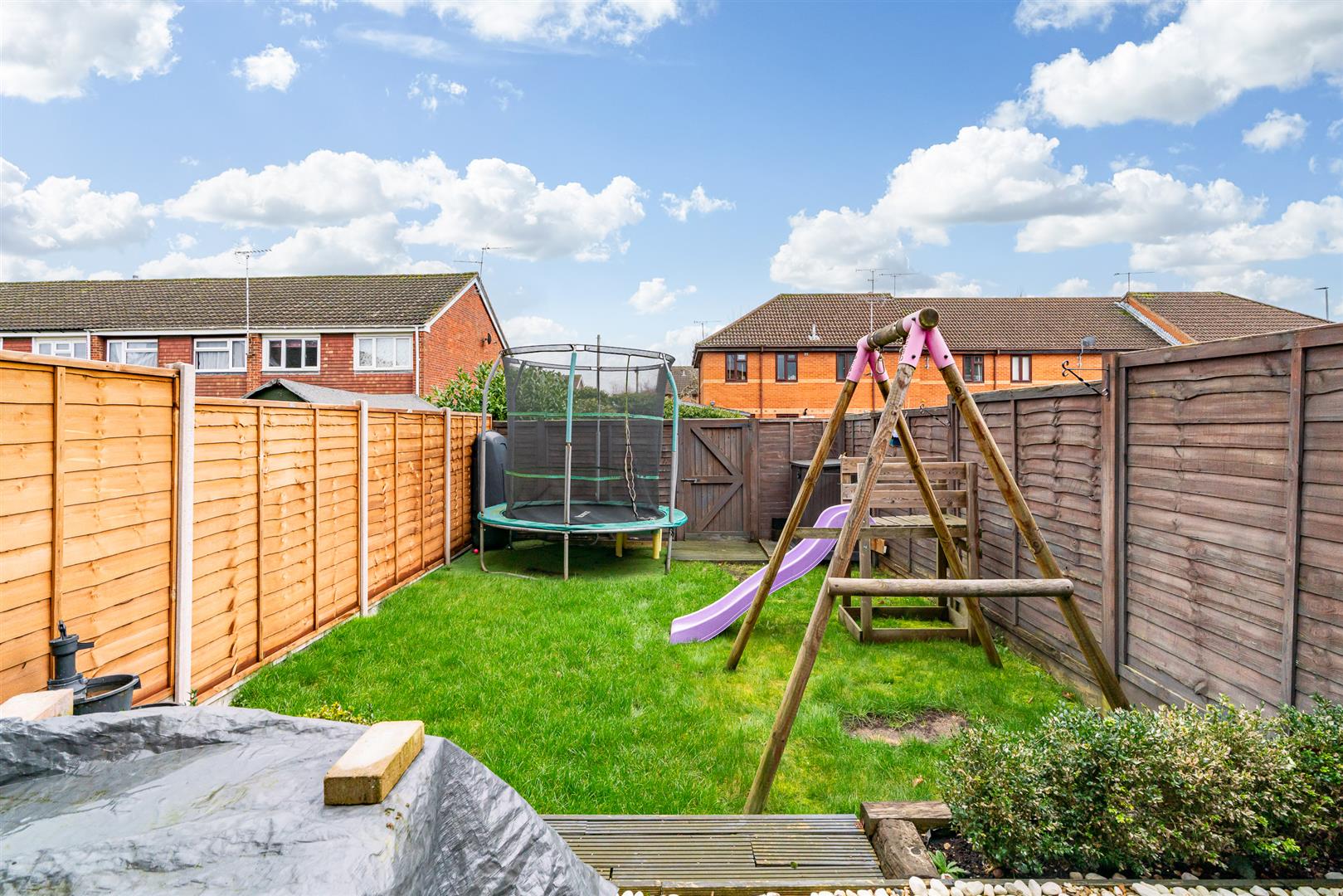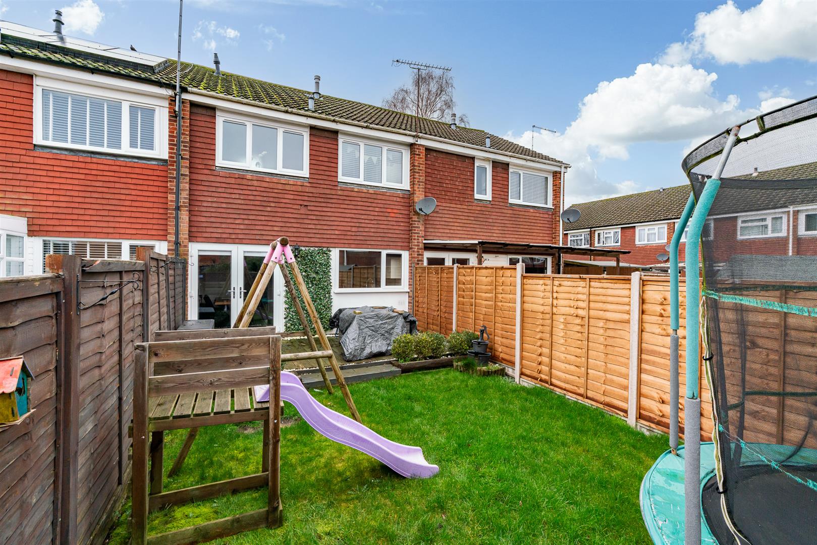Outside - Rear - Low-maintenance garden with decked area and lawn, rear access gate, plus external power sockets and lighting.