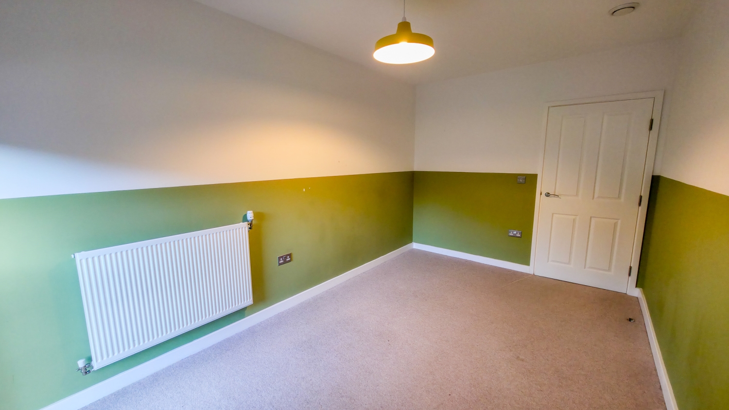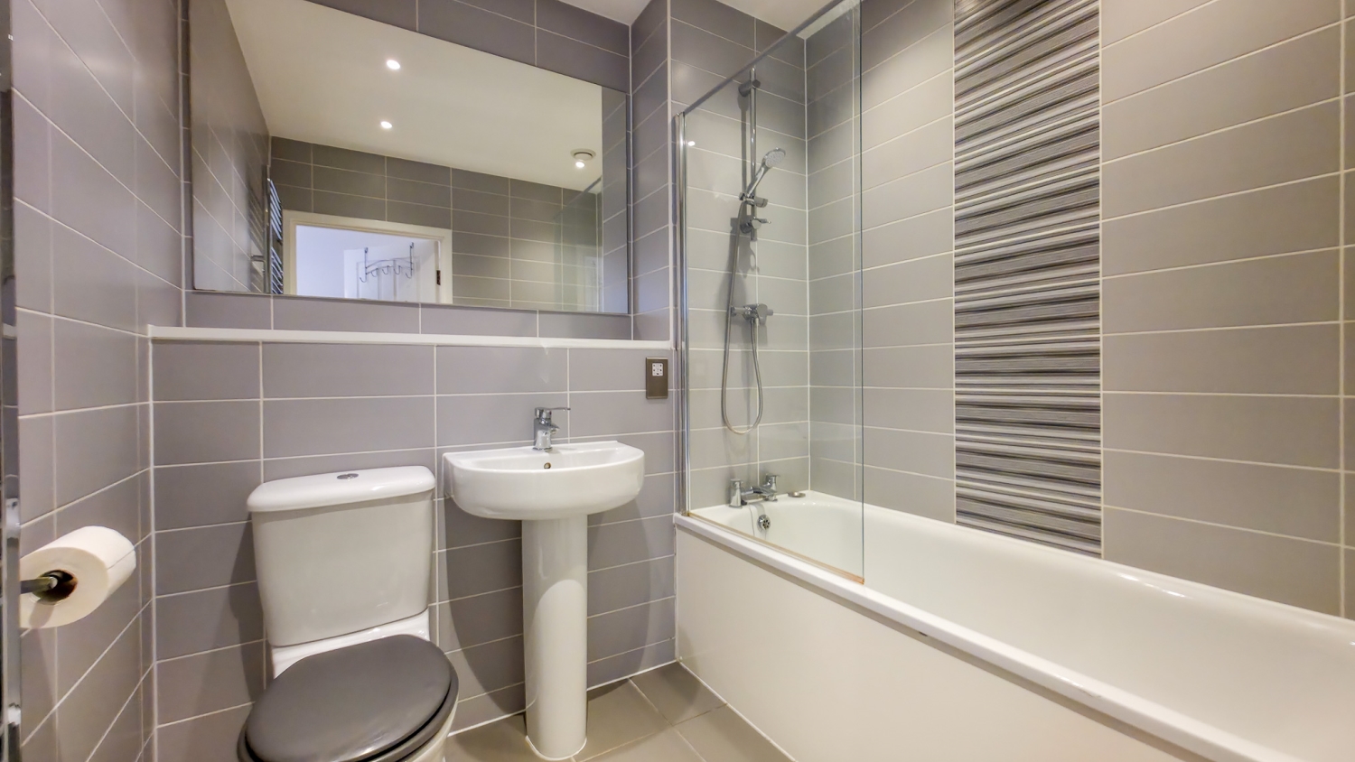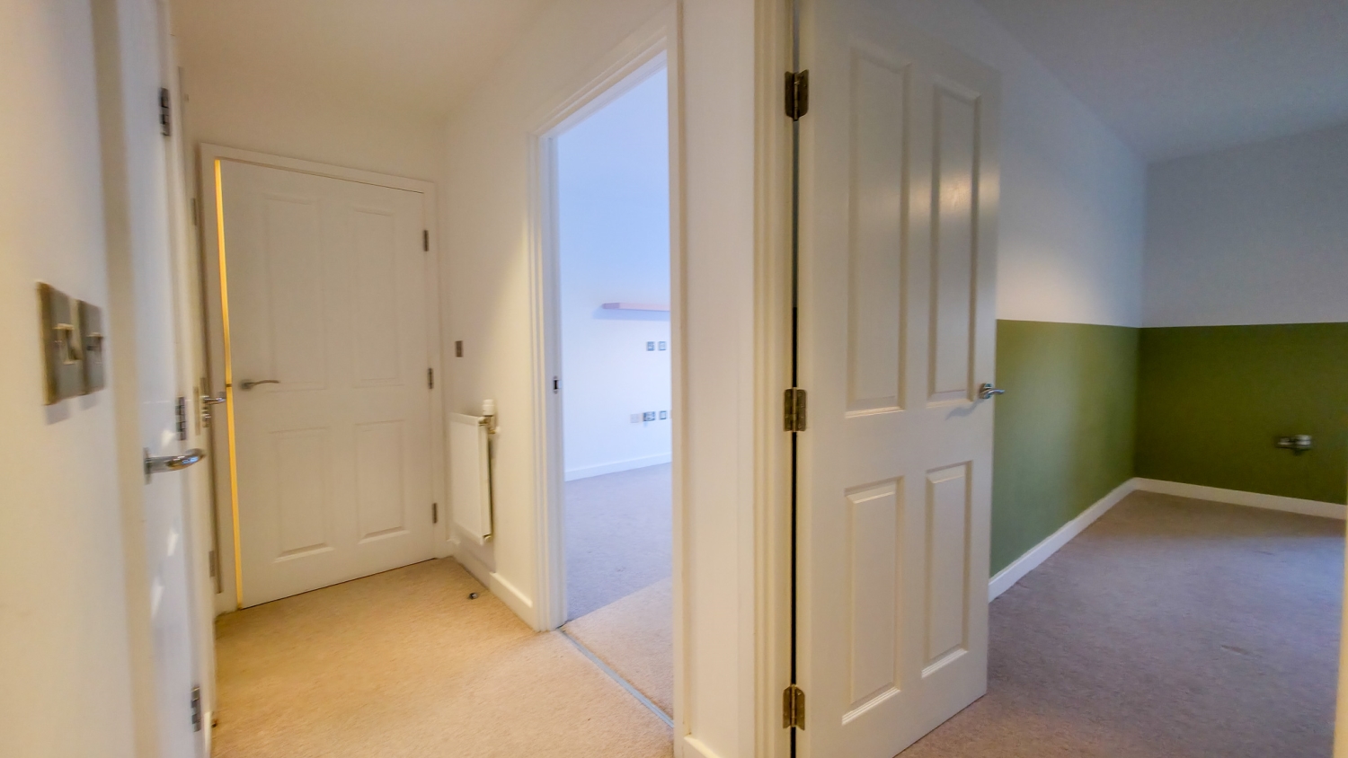 Upstairs, you'll find two well-proportioned double bedrooms, both flooded with natural light and offering ample room for storage. The modern family bathroom is finished to a high standard with stylish tiling, a full-sized bath with overhead shower, and quality fixtures. A wide landing area with further storage adds to the feeling of space and ease.