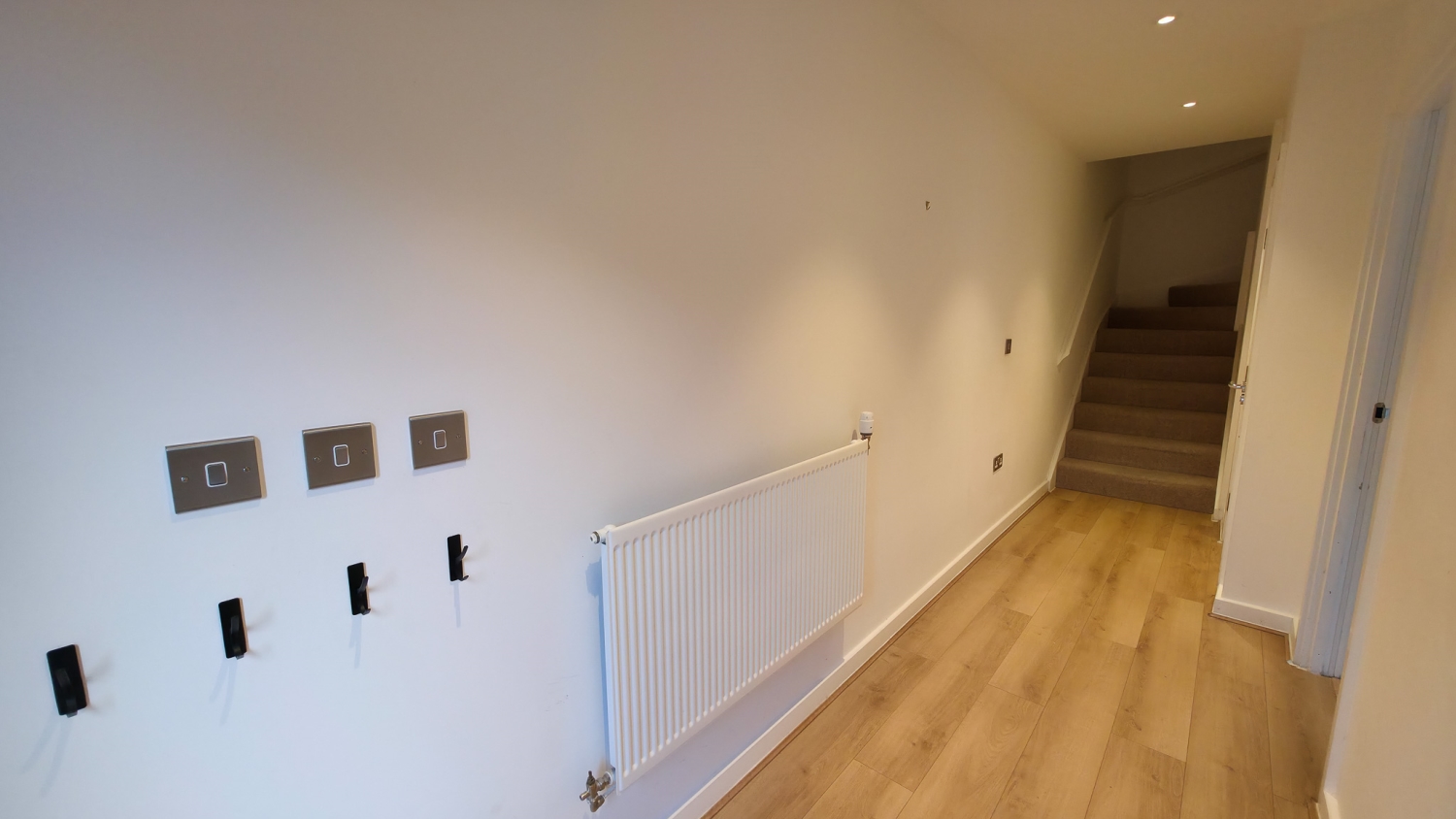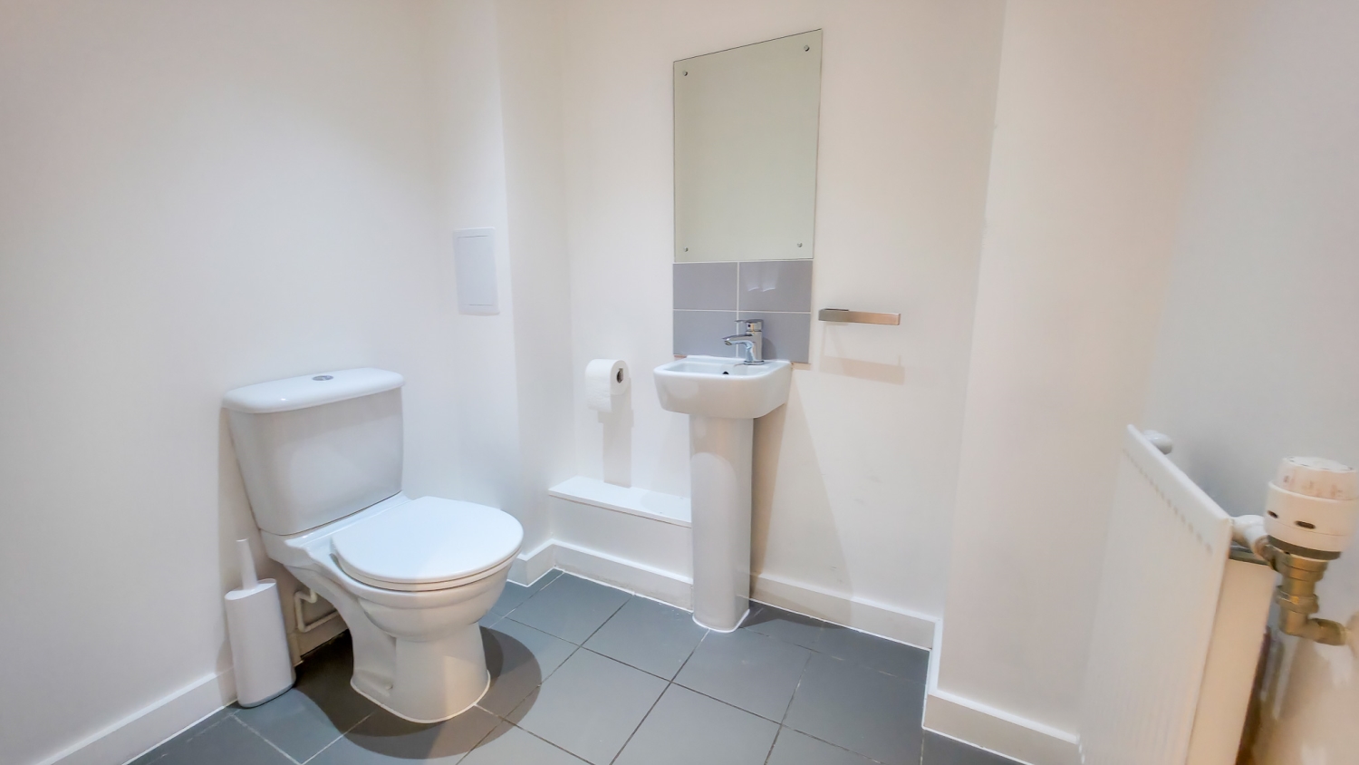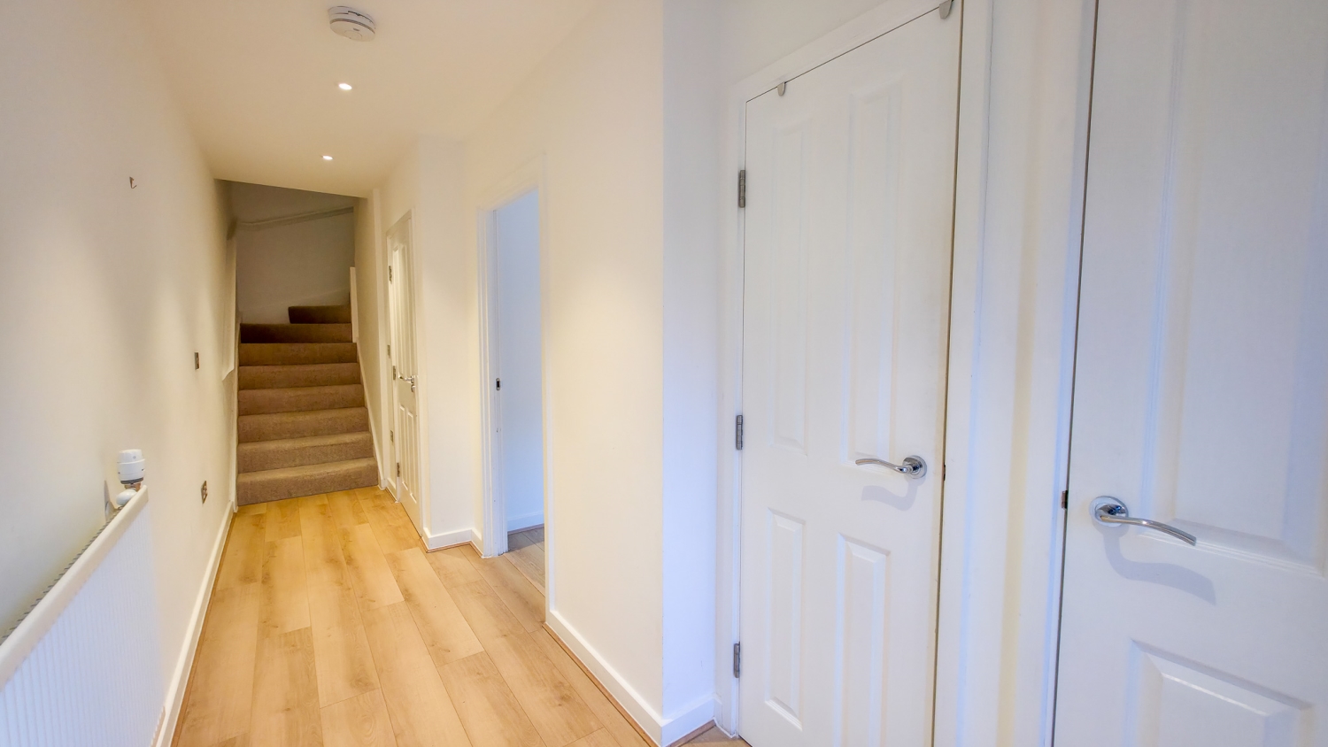 Upstairs, you'll find two well-proportioned double bedrooms, both flooded with natural light and offering ample room for storage. The modern family bathroom is finished to a high standard with stylish tiling, a full-sized bath with overhead shower, and quality fixtures. A wide landing area with further storage adds to the feeling of space and ease.