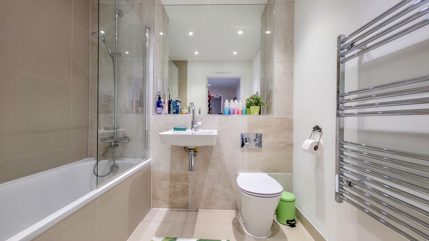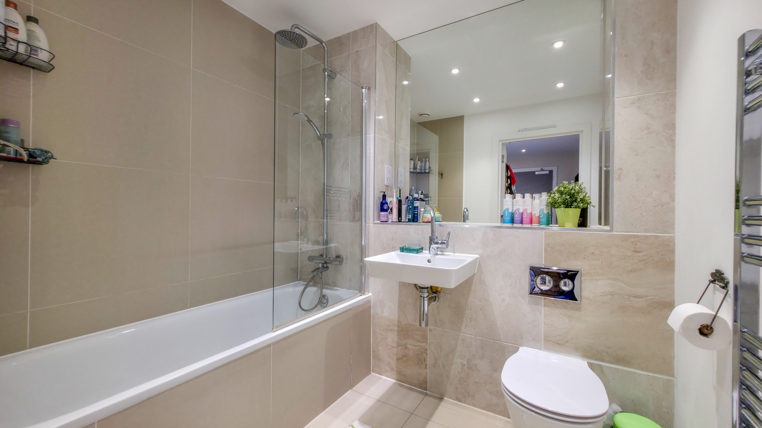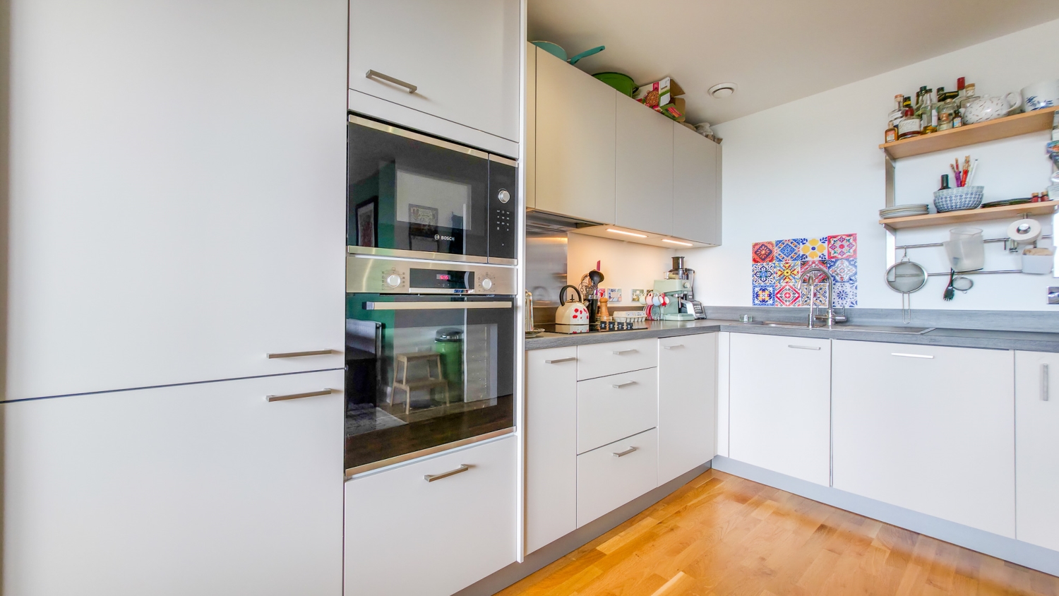 The property features two well-proportioned bedrooms, with bespoke finishes, ample storage, and large windows that enhance the bright and airy feel. A contemporary kitchen is fitted with high-quality integrated appliances and sleek cabinetry, while the bathroom offers a luxurious touch with modern tiling and designer fittings.
