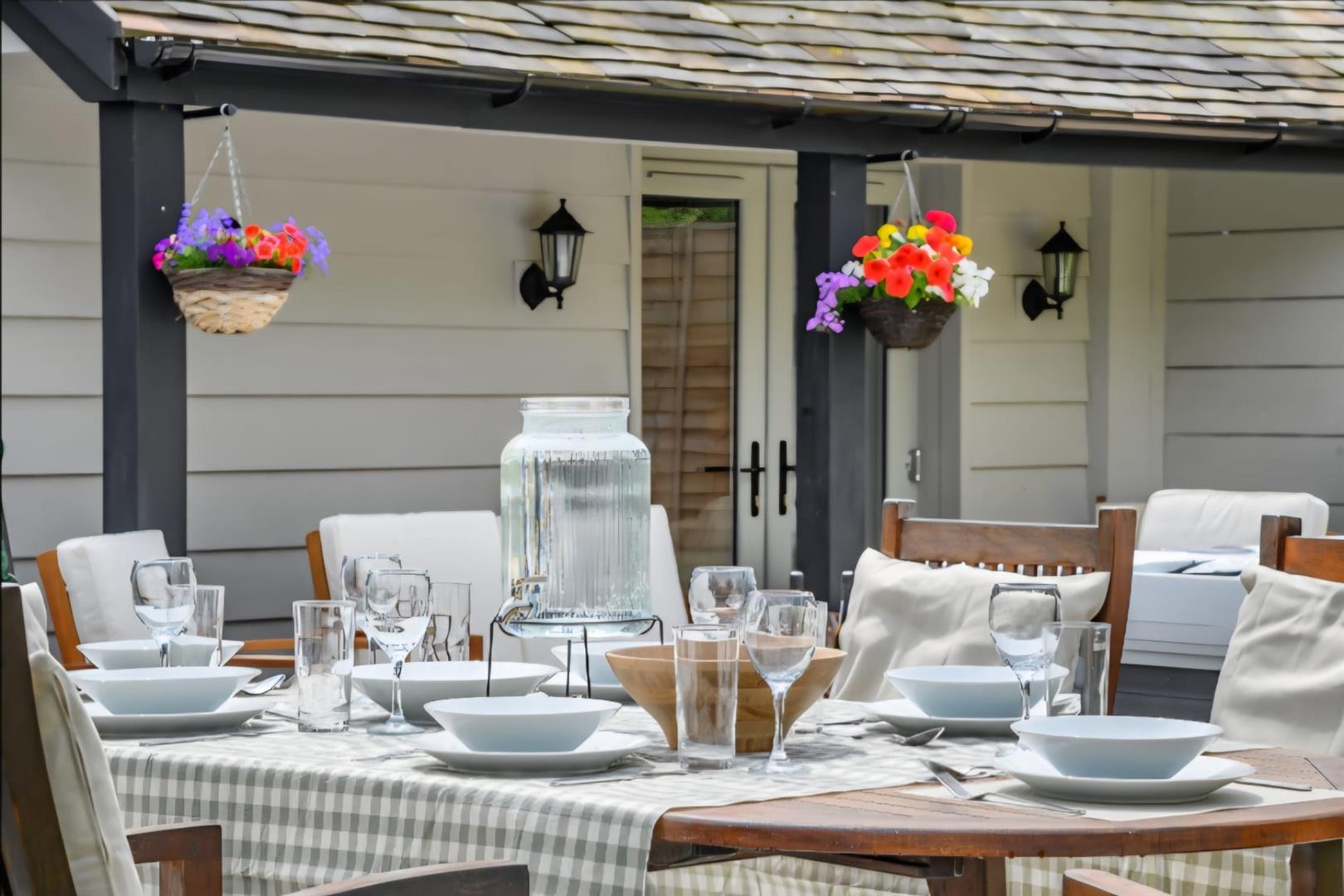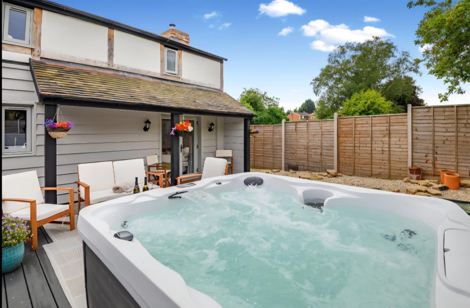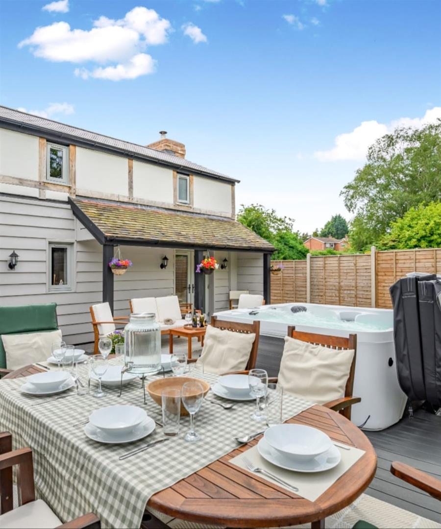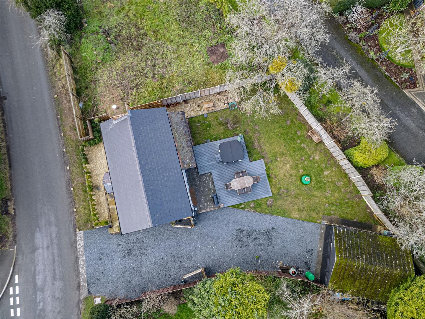 Laid to lawn with raised decked area housing a hot tub. (Available with separate negotiation) External lighting. Outside tap. Electric point.