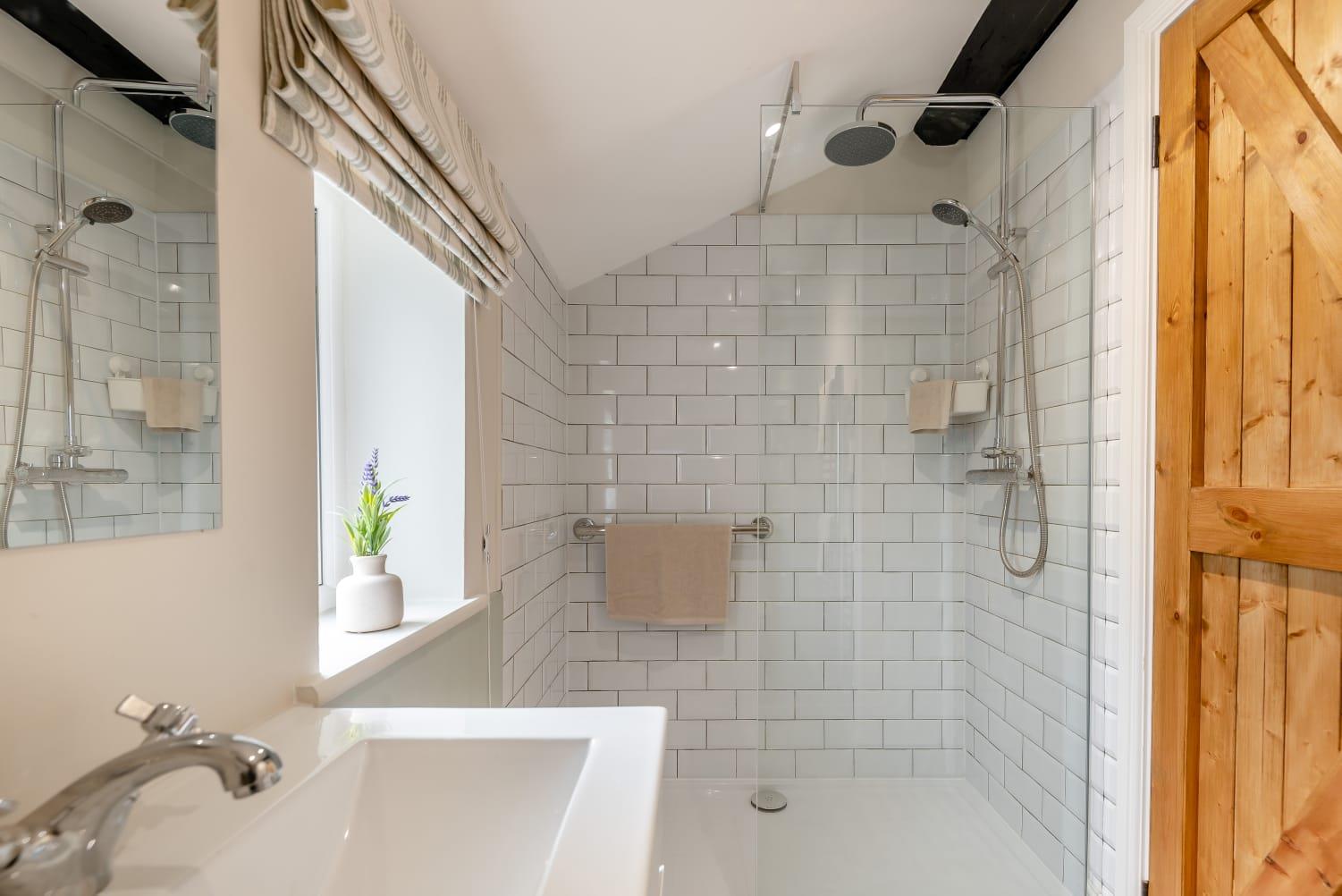 Double shower cubicle with tiled surround and screen. Low level WC. Vanity wash hand basin. Chrome heated towel rail. Ceiling spotlights. Obscure double glazed window to the rear aspect.