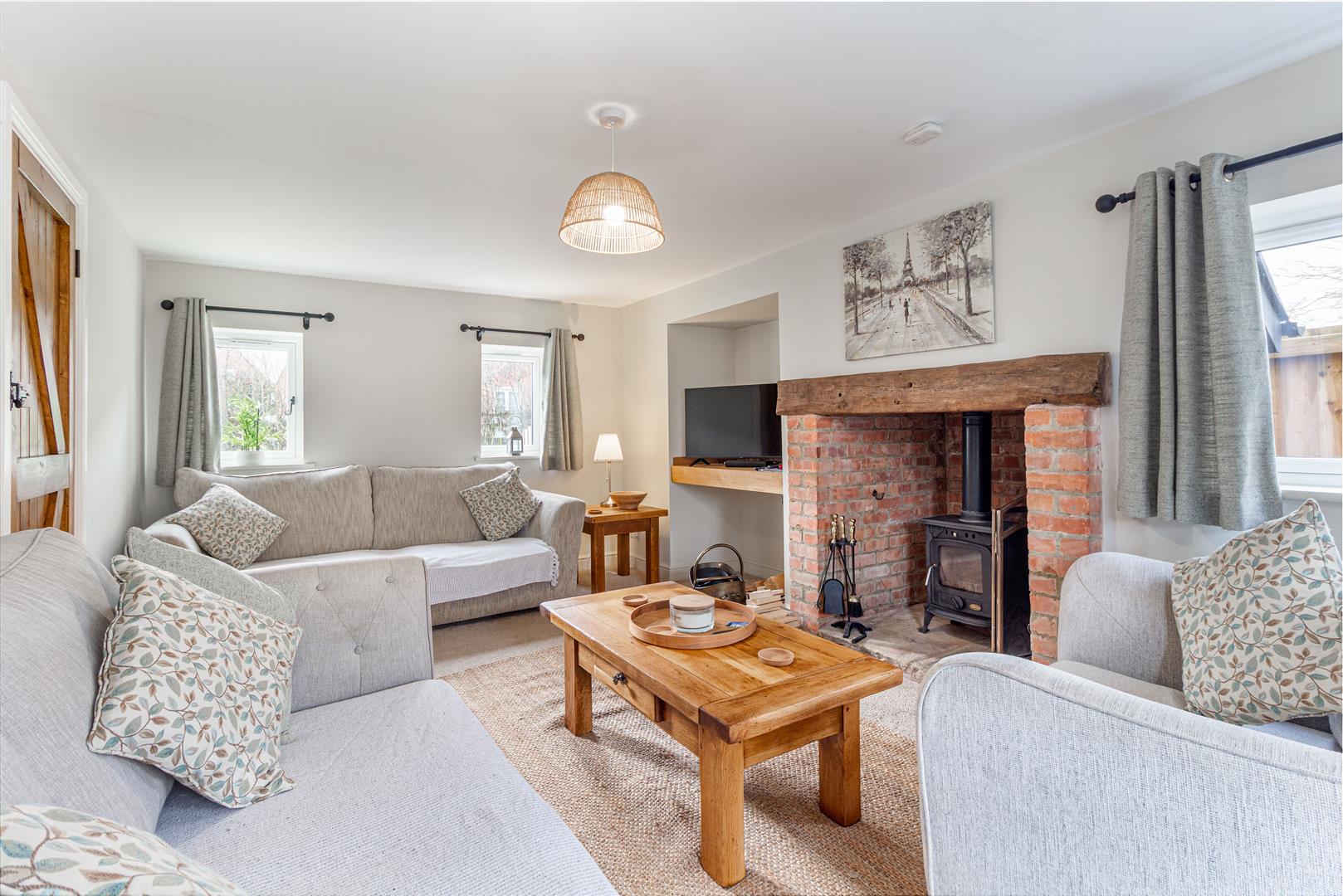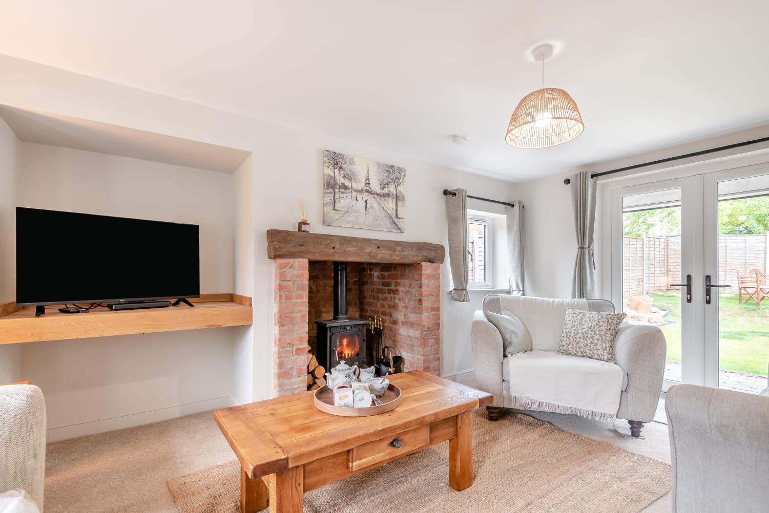 Fireplace with brick surround and oak beam housing a wood burning stove. Double glazed windows to front and side aspects. Double glazed doors opening to the rear garden. CLP.