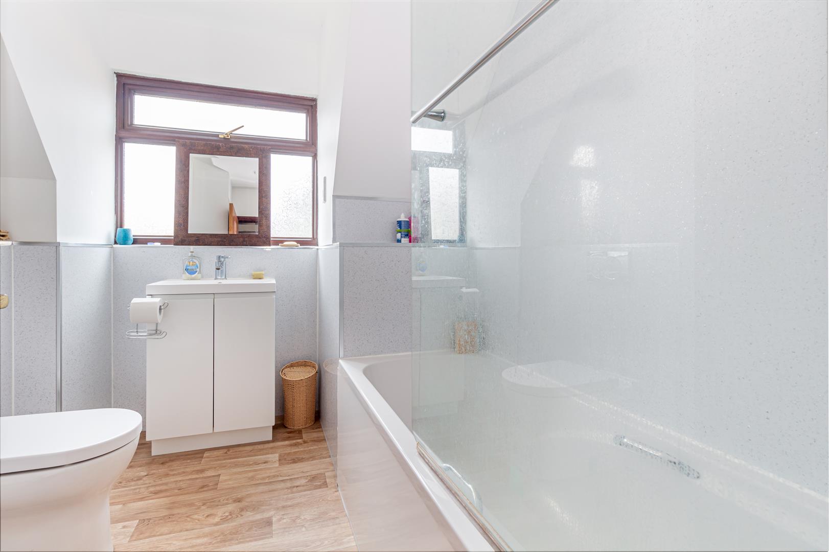 Bathroom - Obscure double glazed window to side aspect. Radiator. Ceiling light point. Panelled bath with mains fed shower. Wash hand basin atop vanity unit. Low level WC. Panelled splashbacks.