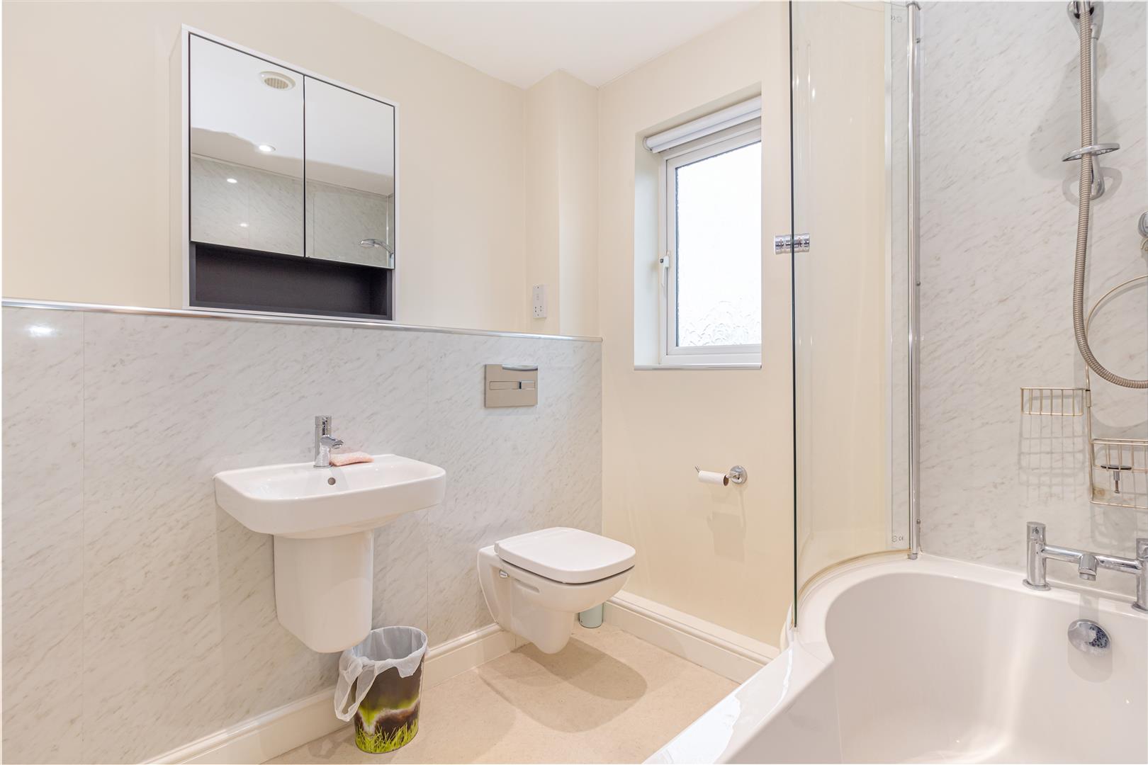 Bathroom - Half tiled walls. Ceiling spotlight. Obscure double glazed window to rear aspect. Wall hung wash hand basin. Low level WC. Panelled bath with shower over. Chrome heated towel rail.