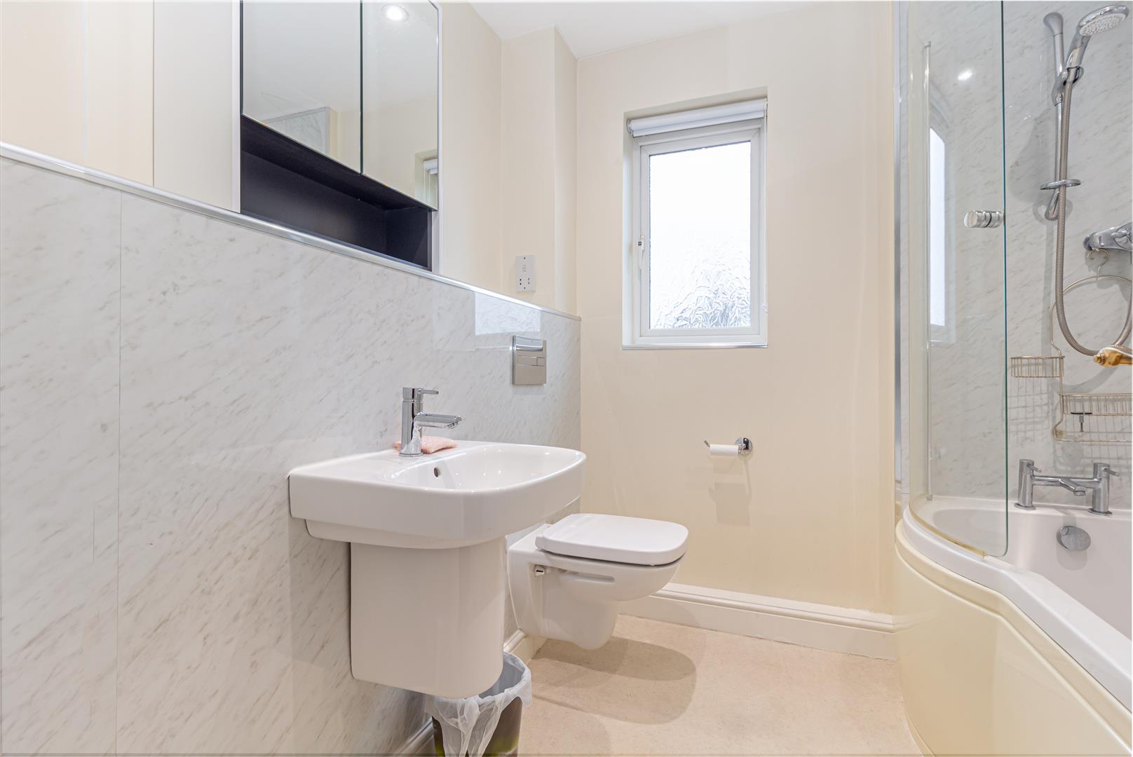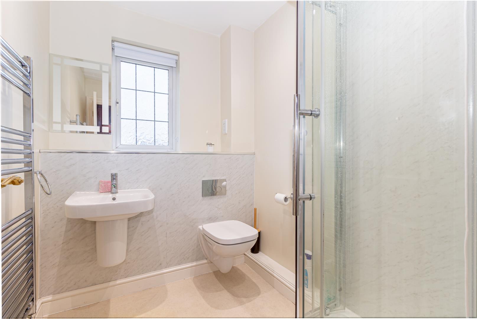 Ensuite - Chrome heated towel rail. Low level WC. Wall hung wash hand basin. Obscure double glazed window to side aspect. Tiled shower cubicle. Ceiling spotlights.
