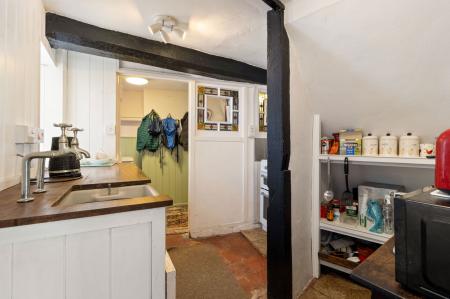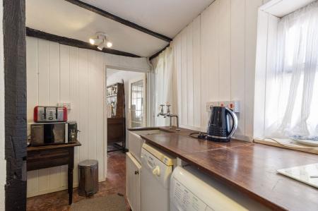 Character beams and tiled flooring. Two ceiling lights. two single glazed sash windows to the side aspect and radiator. Wooden worktop with base units and farmhouse ceramic sink with mixer taps. Free standing oven and space for appliances. Two detailed featured glass panels and wooden door leading into the entrance hall