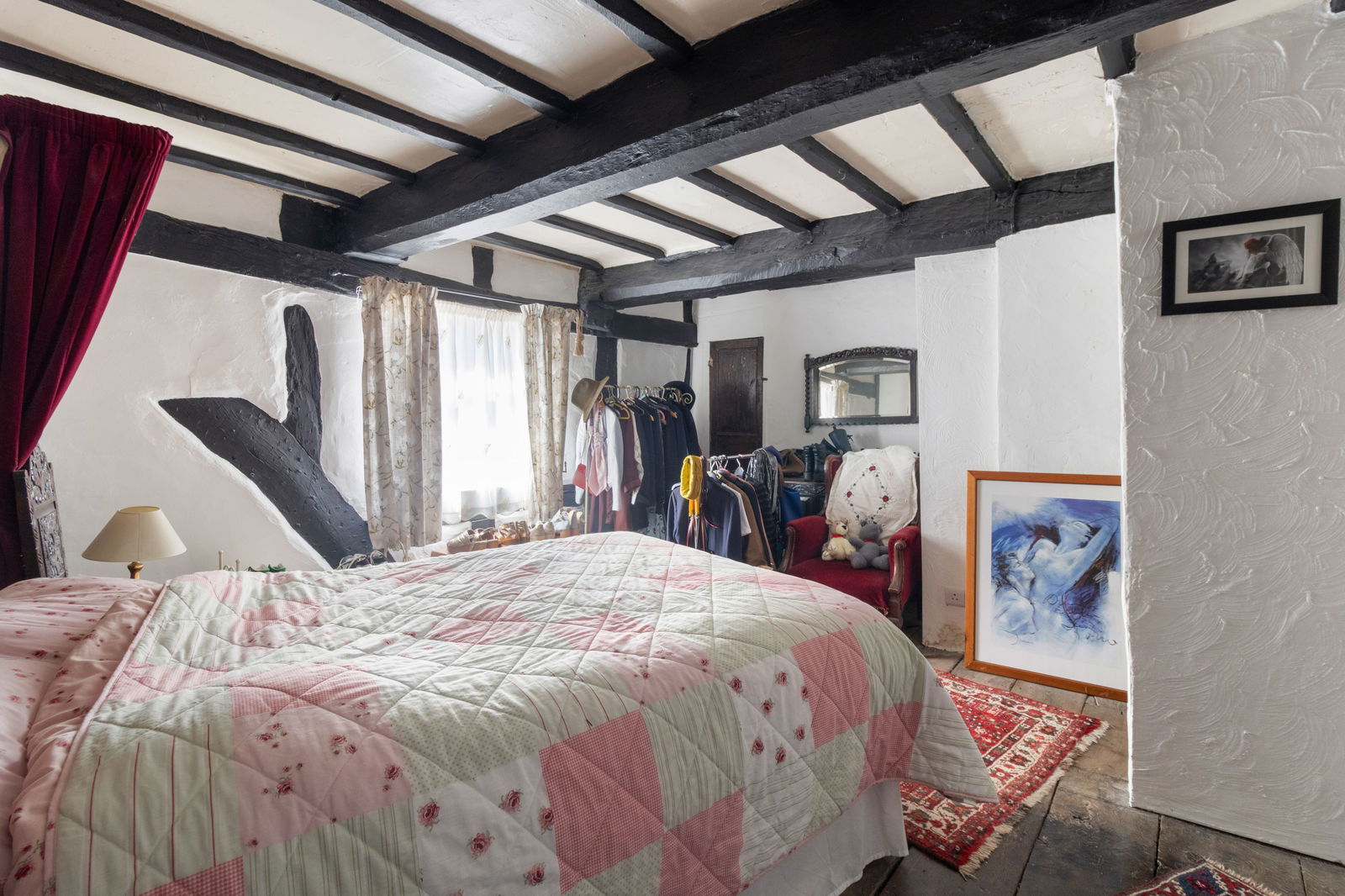 Spacious bedroom with character beams to ceiling and walls, front facing single glazed window, wooden flooring and radiator.