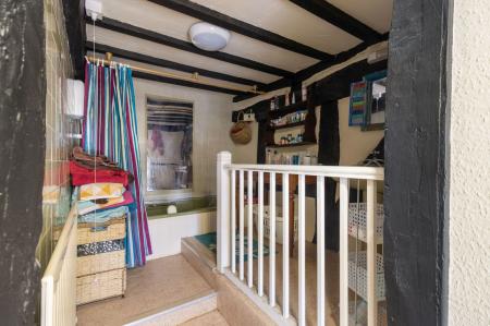 Spacious bathroom with single glazed window to rear aspect. Two ceiling lights and radiator. Tiled walls and feature beams to wall and ceiling. Suite comprising of low level WC with a step up to the bath with shower above and sink.