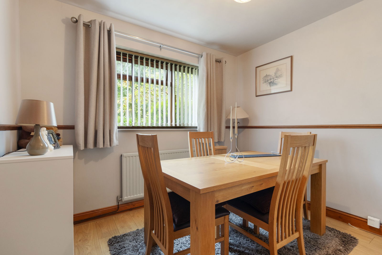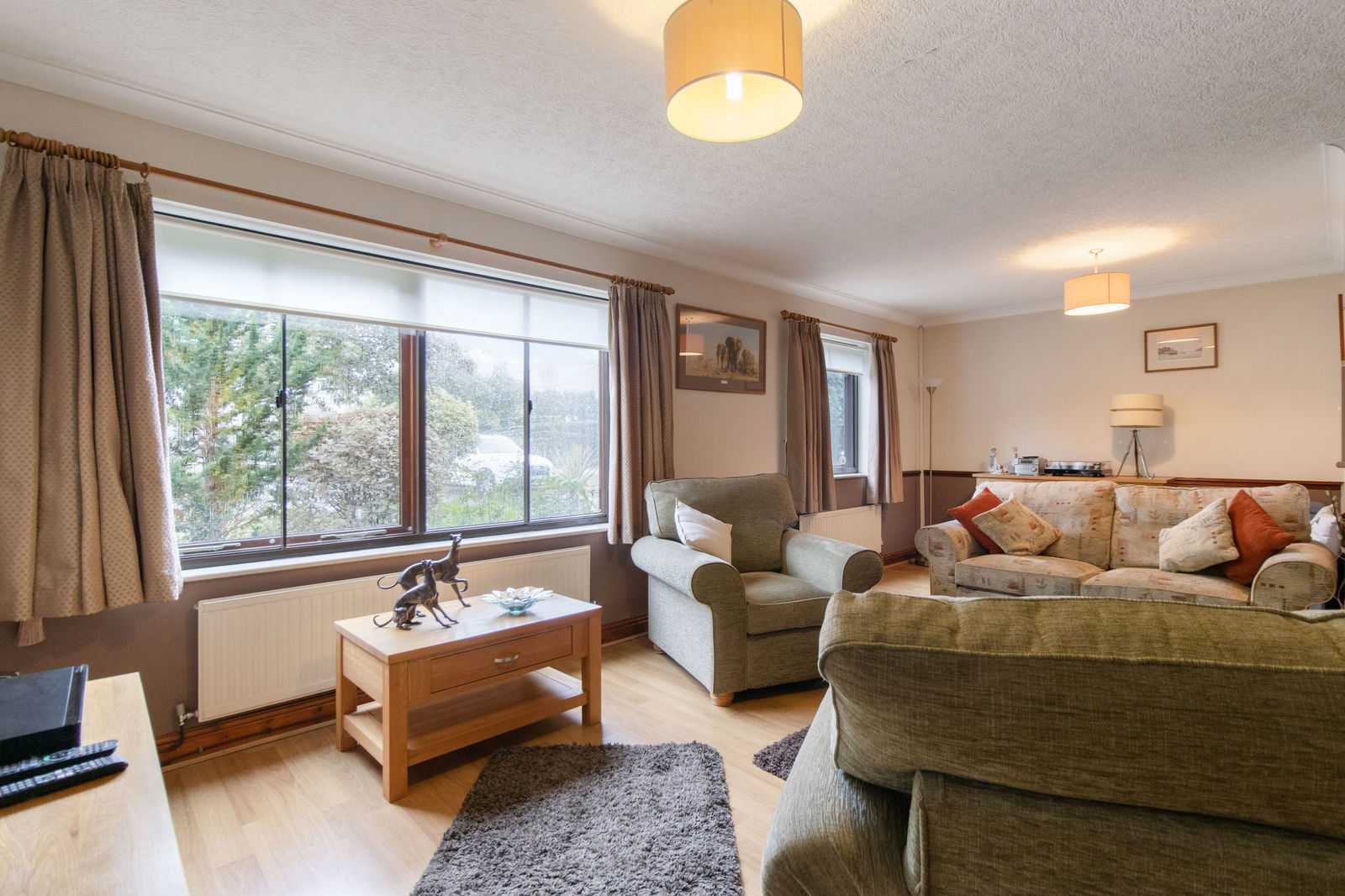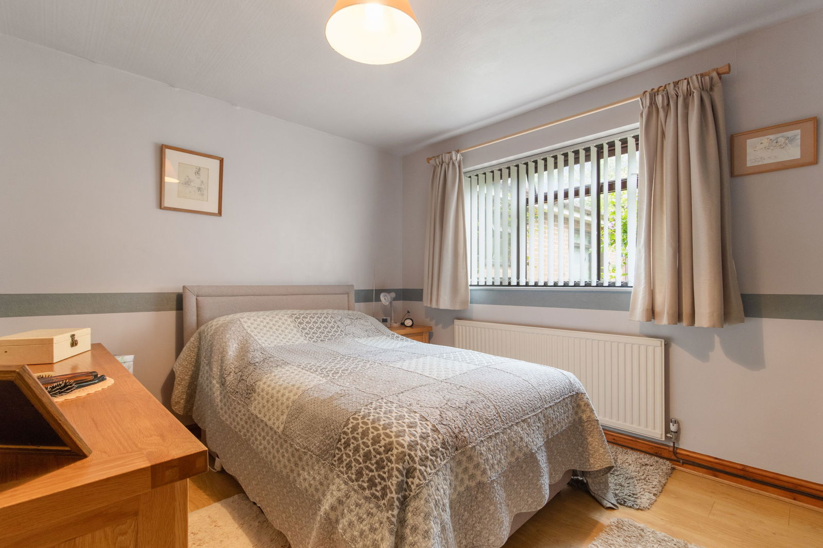 Laminate flooring, radiator, double glazed window to the side with additional glazing, pendant light fitting.