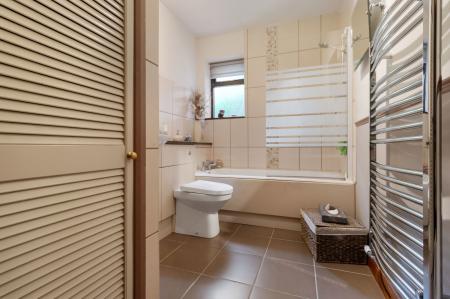 Tiled floor and partially tiled walls.  Close coupled WC and vanity wash hand basin with cupboard below.  Airing cupboard, chrome heated towel rail, panelled bath with shower connected, obscured glazed window to the side, ceiling light fitting, loft access point and shaving point.