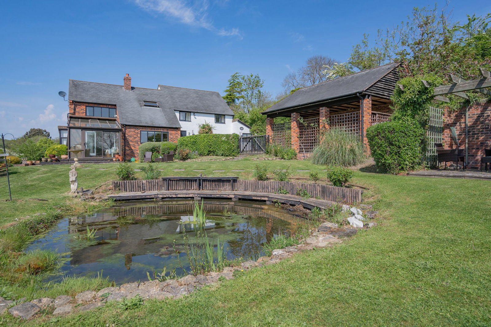 Outside the grounds wrap around the property beautifully top three sides being mainly laid to lawn an large ornamental pond and leading to planted and sloped beds displaying colour and vibrance throughout the year.  Behind the pond is a wonderful paved Gazebo making a wonderful seating area where the pleasantries of this fantastic setting can be enjoyed.  A decked area from the conservatory steps down to the lawn and there is gated pedestrian access through to the driveway.  A path descends down to the equestrian land that wraps around the formal garden to three sides and in total extends to approximately four acres with the property having a back drive with metal vehicular gate giving access to the paddock.