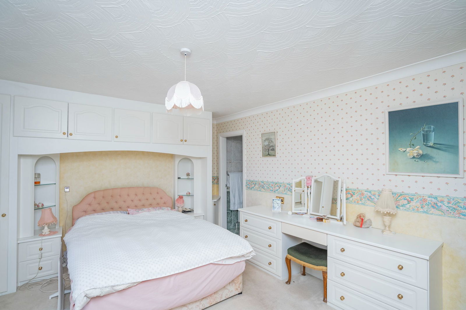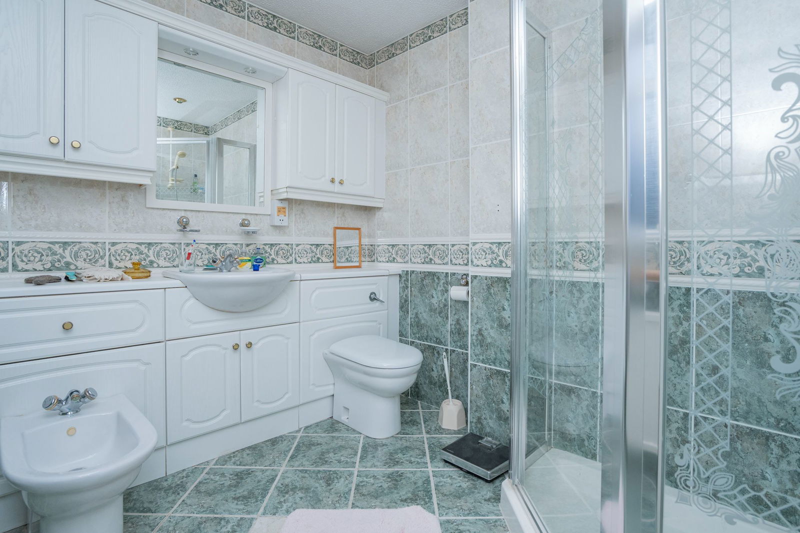 The master bedrooms has a large En-suite shower room with vanity wash hand basin, close coupled WC . bidet, separate tiled shower cubicle and built in furniture with mirrored doors.