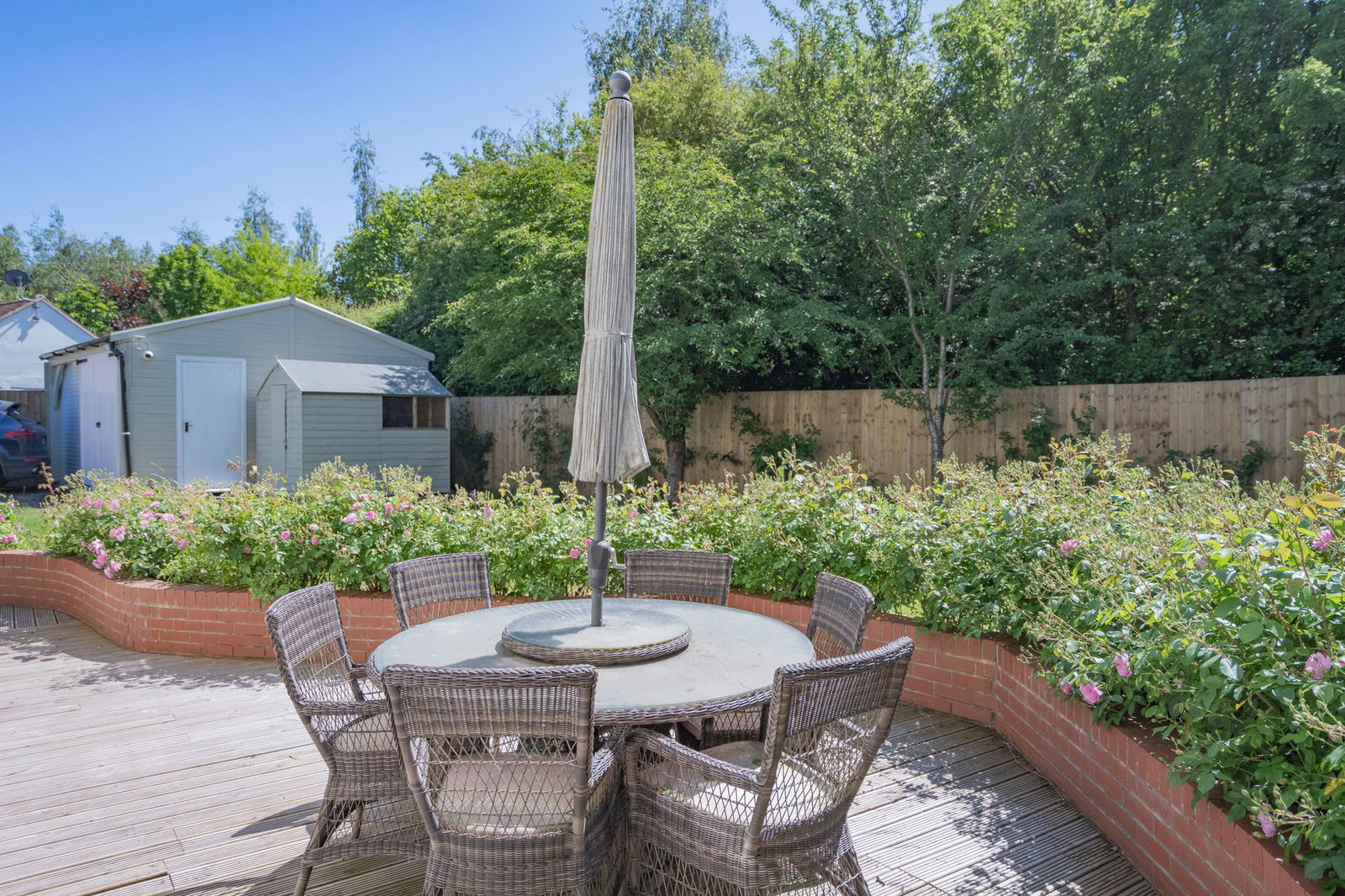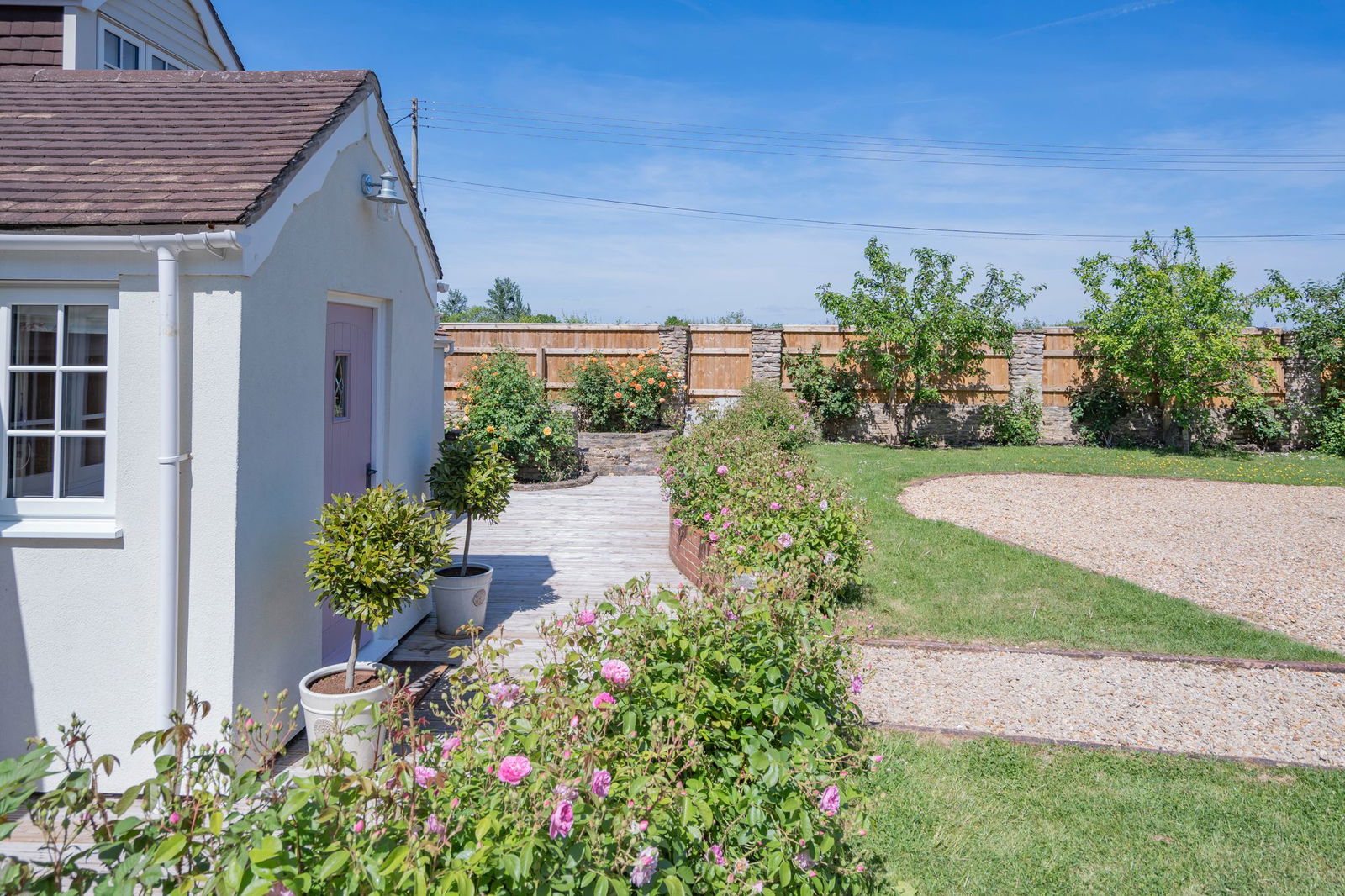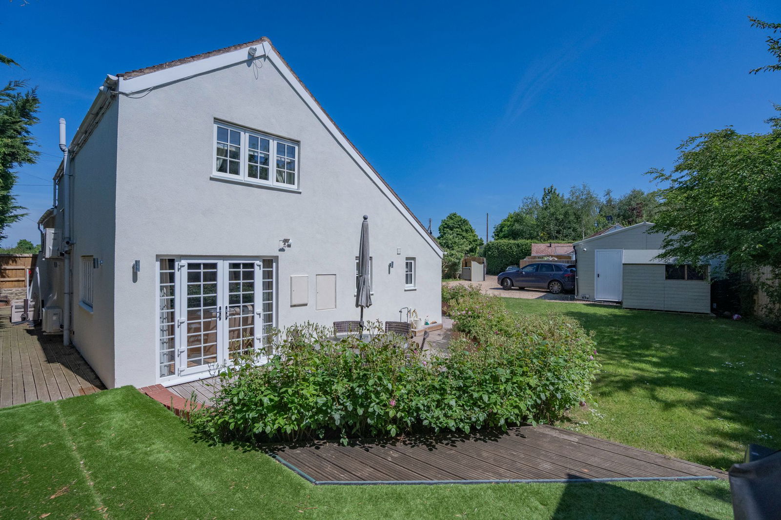 Outside the main property the initial space is given over to parking with a main lawn with mature fruit trees and beautiful beds planted with a variety of roses.  There is feature well and the grass continues to the left hand side of the property giving access to the home office/studio and a further decked area directly outside the double doors for the sitting room and is a wonderful sun trap in the late afternoon.  Within the grounds is a large building which was originally the double garage but is now used as a large home gym with store.