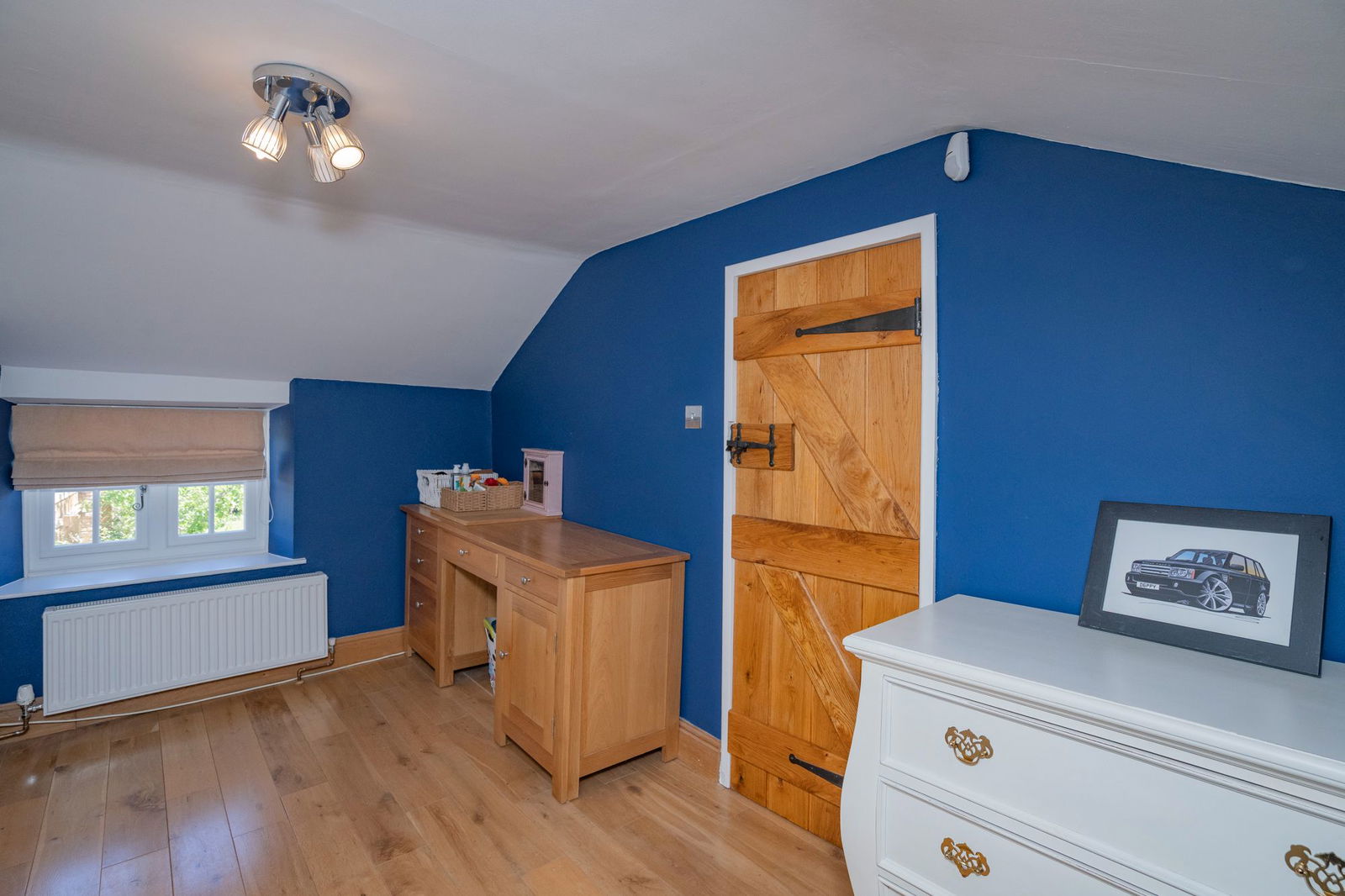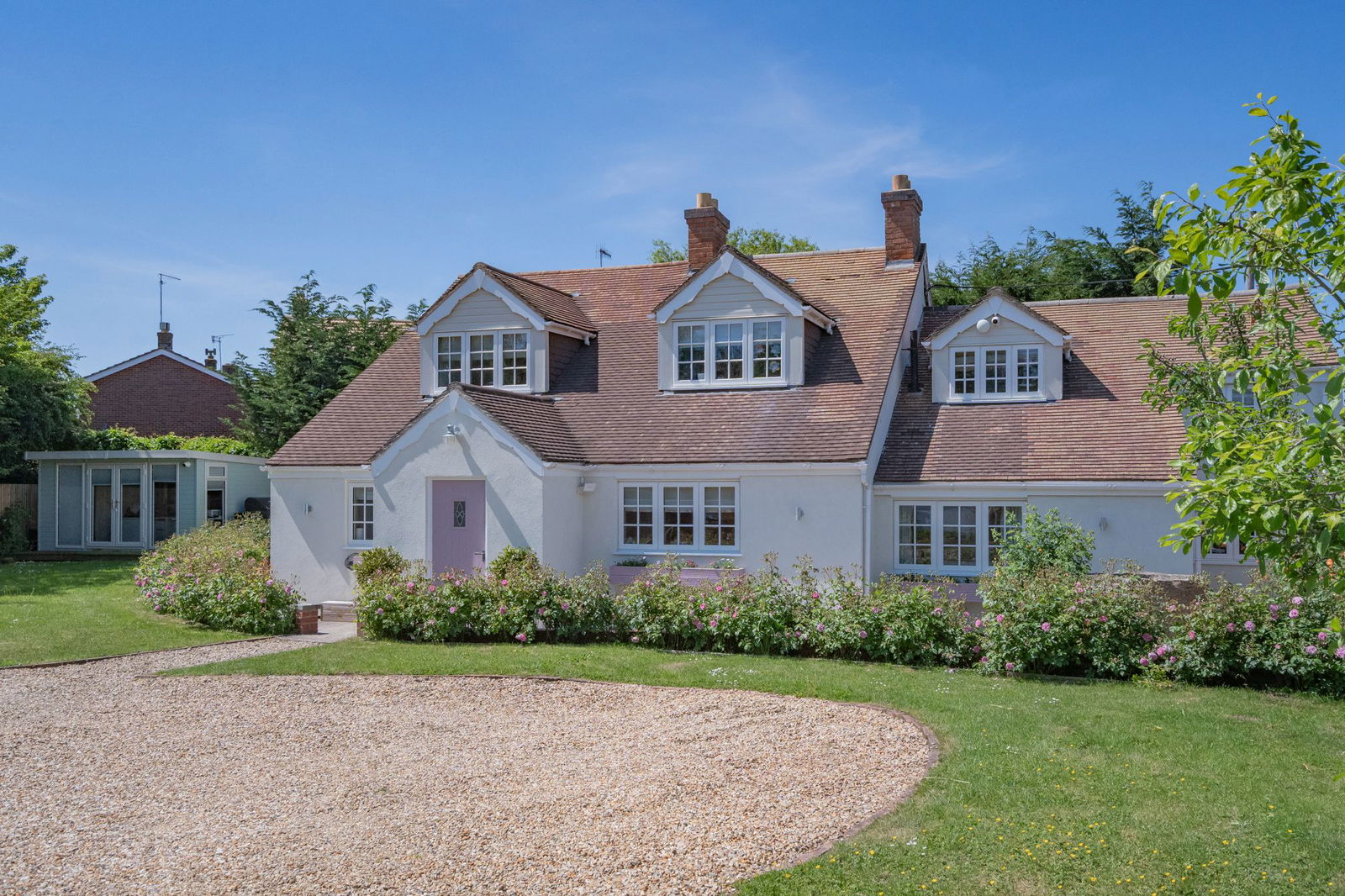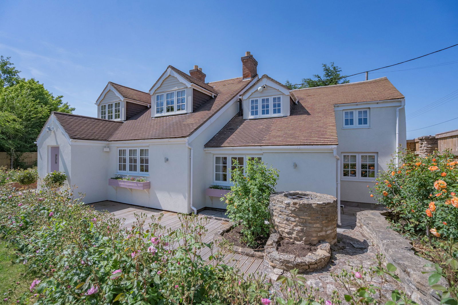 Outside the main property the initial space is given over to parking with a main lawn with mature fruit trees and beautiful beds planted with a variety of roses.  There is feature well and the grass continues to the left hand side of the property giving access to the home office/studio and a further decked area directly outside the double doors for the sitting room and is a wonderful sun trap in the late afternoon.  Within the grounds is a large building which was originally the double garage but is now used as a large home gym with store.