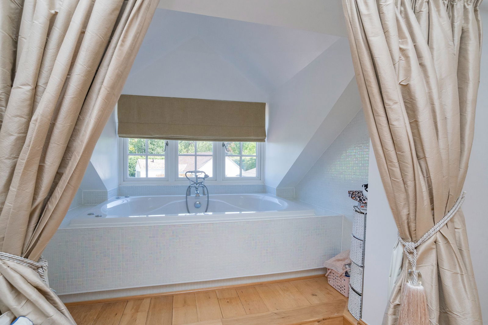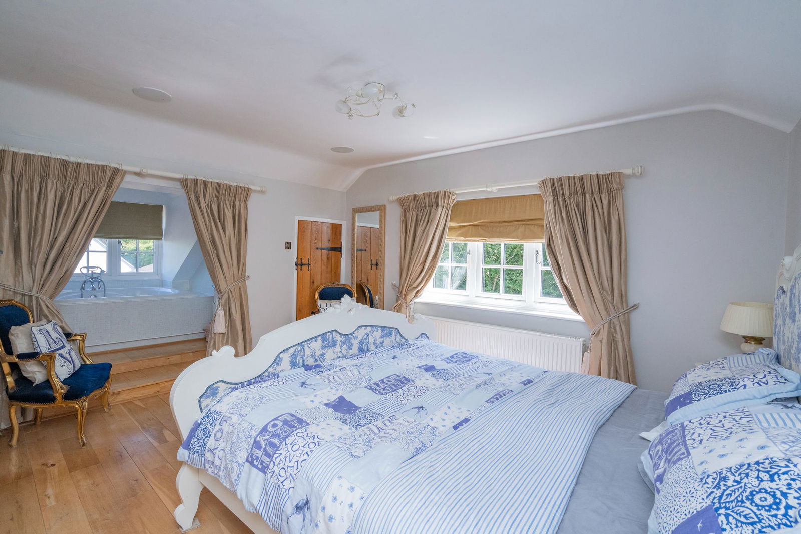 To the first floor the Master Bedroom has a walk-in wardrobe and is beautifully proportioned.  Within the room steps lead up to a deep jacuzzi spa bath set into the dormer and a full en-suite shower room.   Completing the first floor are two further bedrooms with a range of fitted wardrobes complimented and serviced by a refitted  Family Shower Room with a luxurious suite.