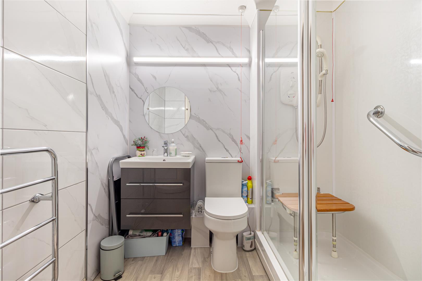 Shower Room - Vanity wash hand basin, WC and walk-in shower with electric shower. Shower screens and glazed door entry. Ceiling light point. Chrome heated towel rail. Panelled splashbacks.