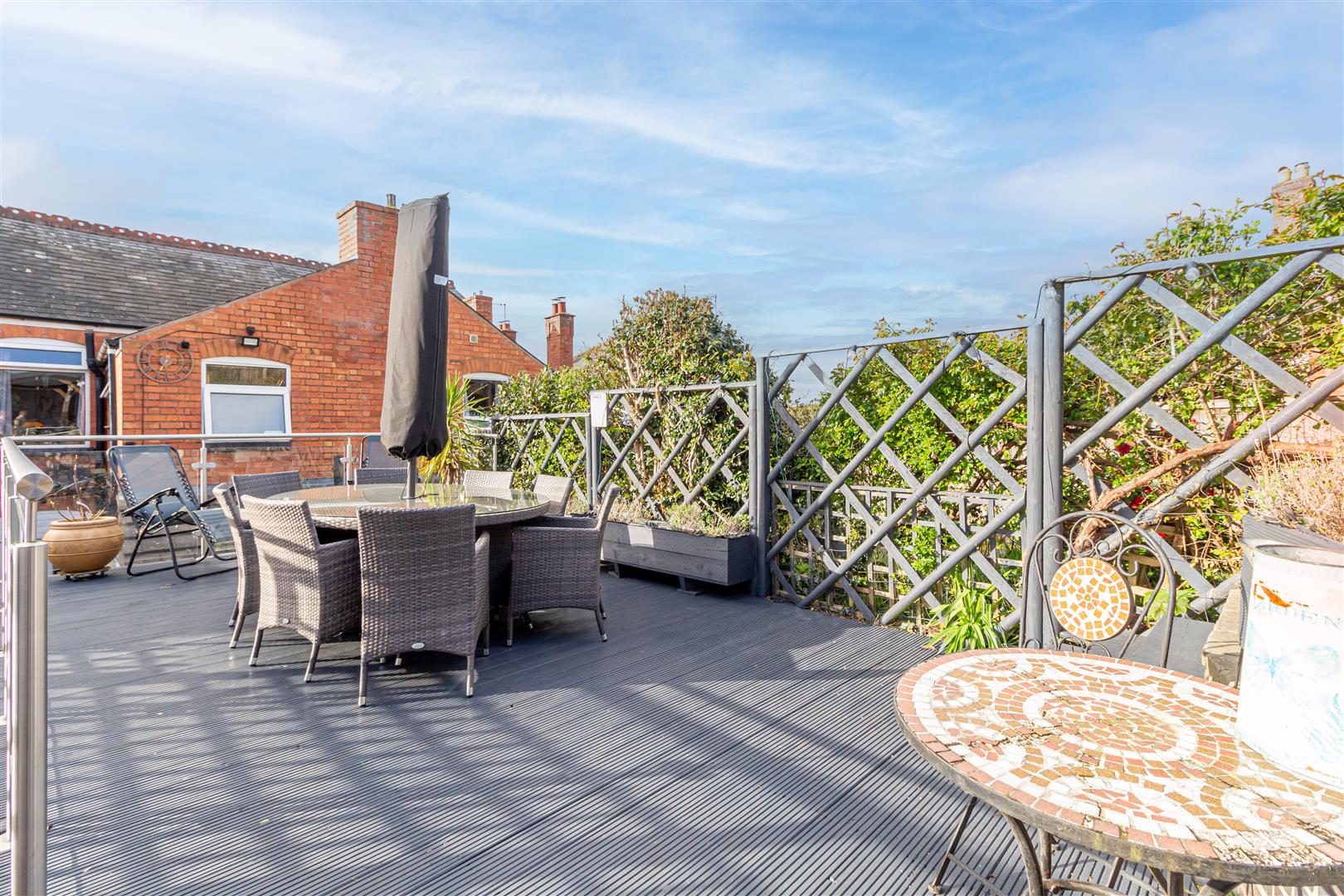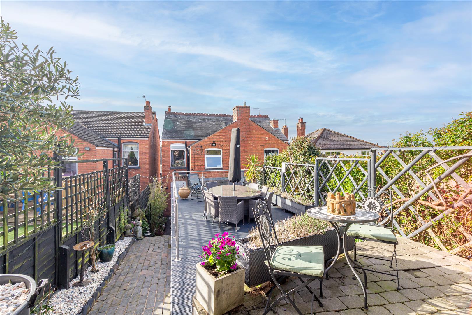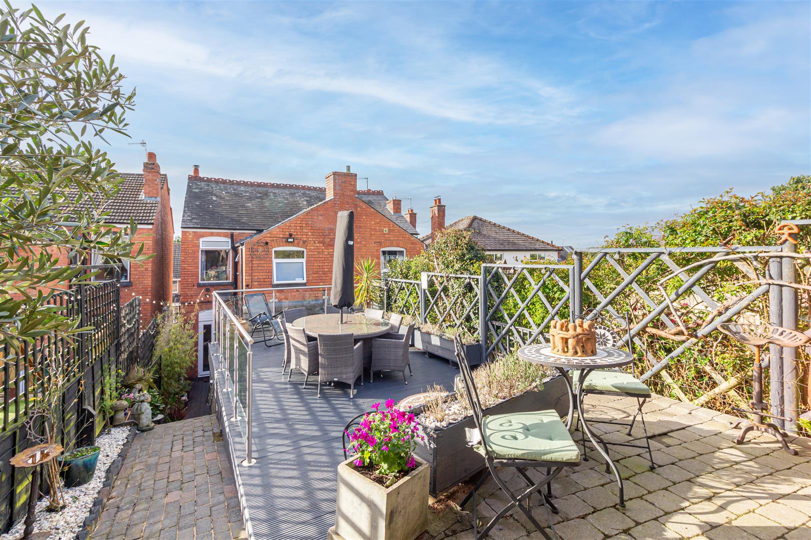 - Rear garden with large decked seating area and under-cover section.