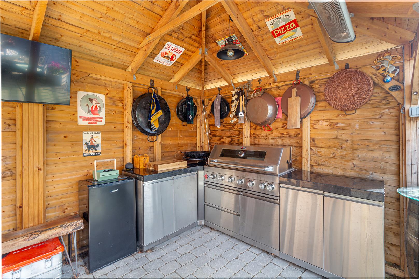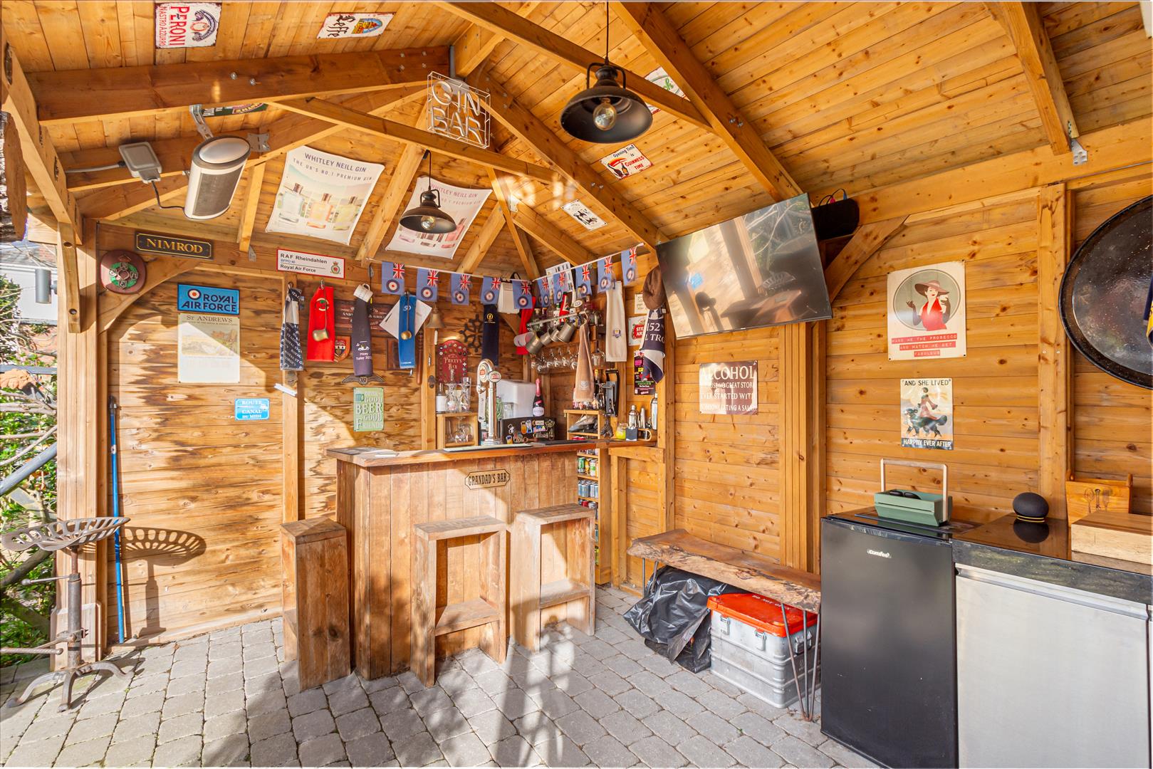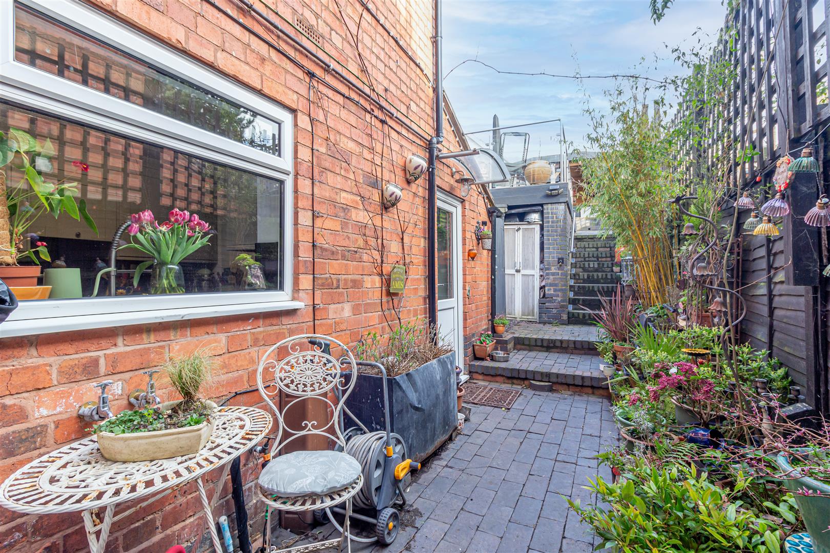 - Rear garden with large decked seating area and under-cover section.