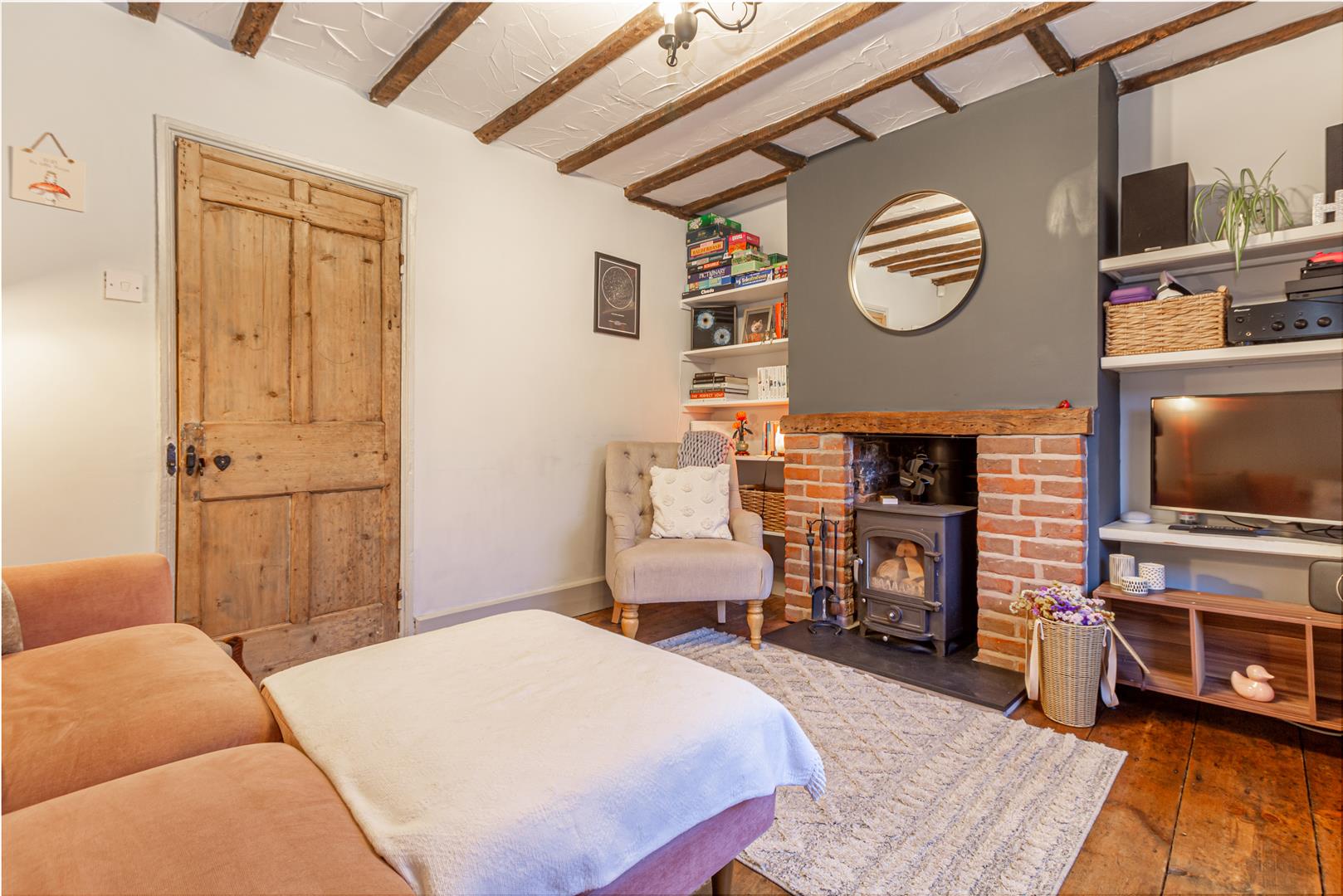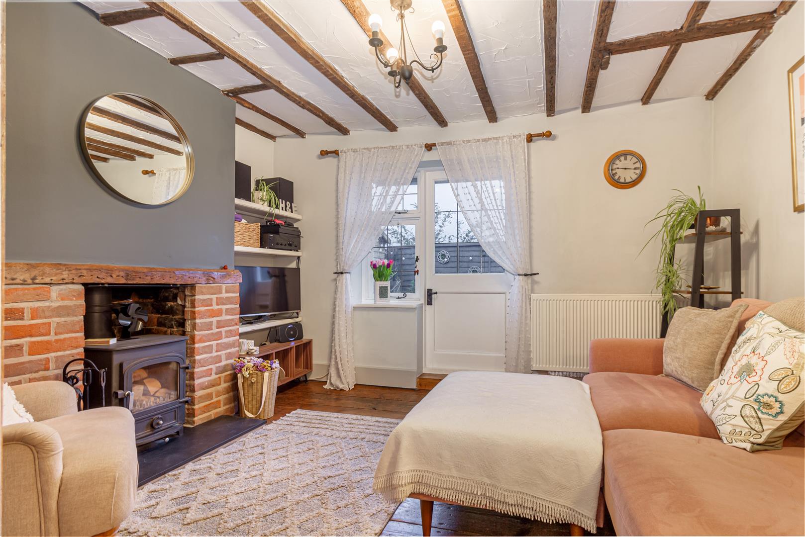 Living Room - Window and door to rear aspect opening to the pleasant courtyard area. This cosy room has a feature wood burner with wooden mantle over and is complemented with stripped wooden flooring and beam work to the ceiling.