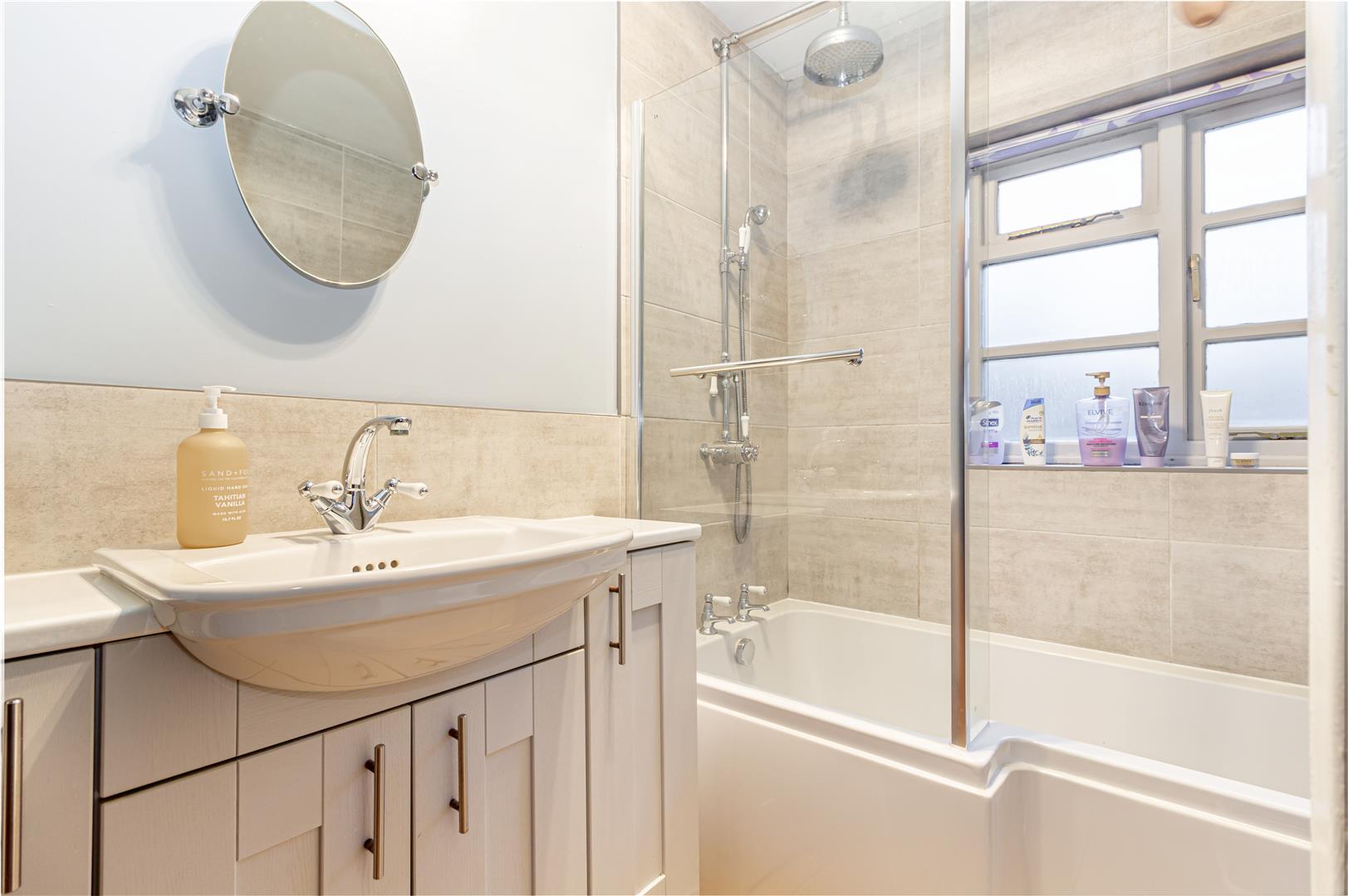 Bathroom - Obscure double glazed window to the front aspect. Bathroom is fitted with suite comprising 'L' shaped panelled bath, wash basin inset to vanity units and low level WC. Tiled floor and part tiled walls.