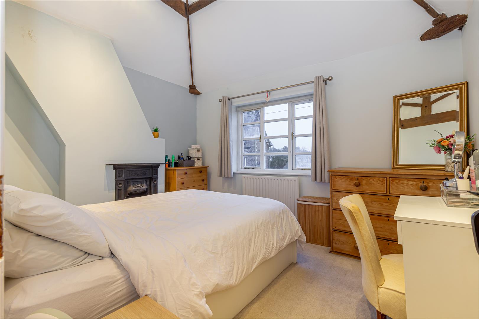 Bedroom Two - Window to the front aspect. Feature fireplace and vaulted ceiling with beam work. Wooden flooring.