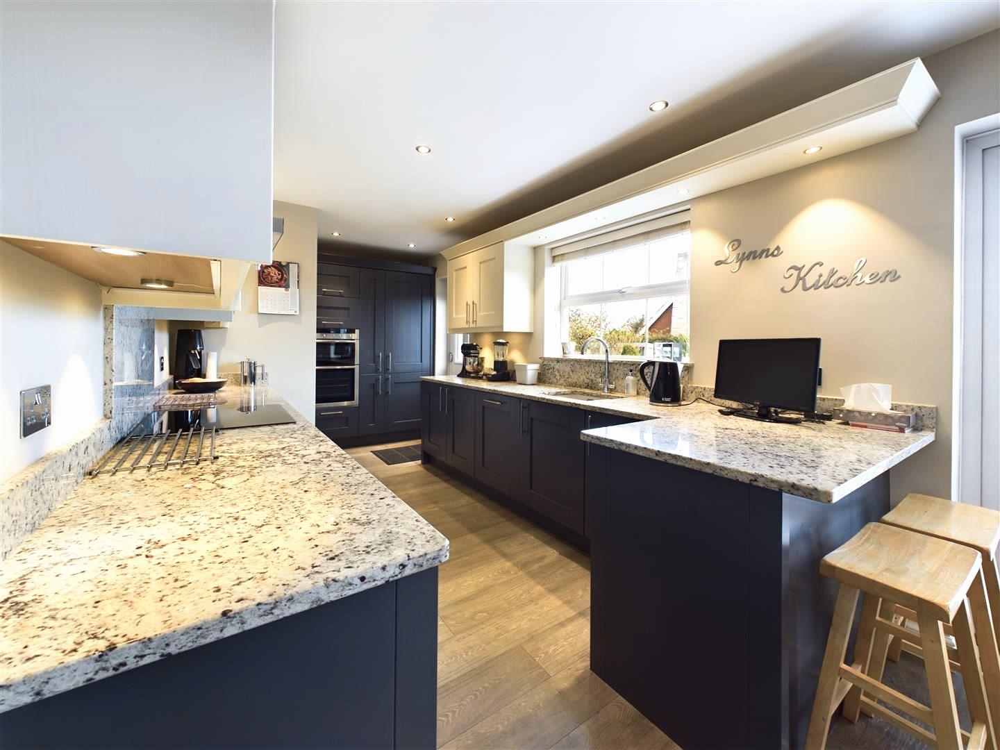 Open Plan Kitchen/Diner - This luxury kitchen combines elegance and functionality with navy and cream shaker-style units, creating a timeless and sophisticated aesthetic. The sleek granite worktop provides a polished surface for cooking and entertaining, while the fitted induction hob offers precise, energy-efficient cooking. A built-in dishwasher and fridge/freezer add convenience, and the stylish extractor ensures a fresh atmosphere. The laminate heated flooring keeps the space cosy, while spotlights illuminate key areas, and ambient lighting creates a warm, inviting atmosphere, perfect for both everyday use and hosting guests. Dining area has french door leading onto the rear garden.
