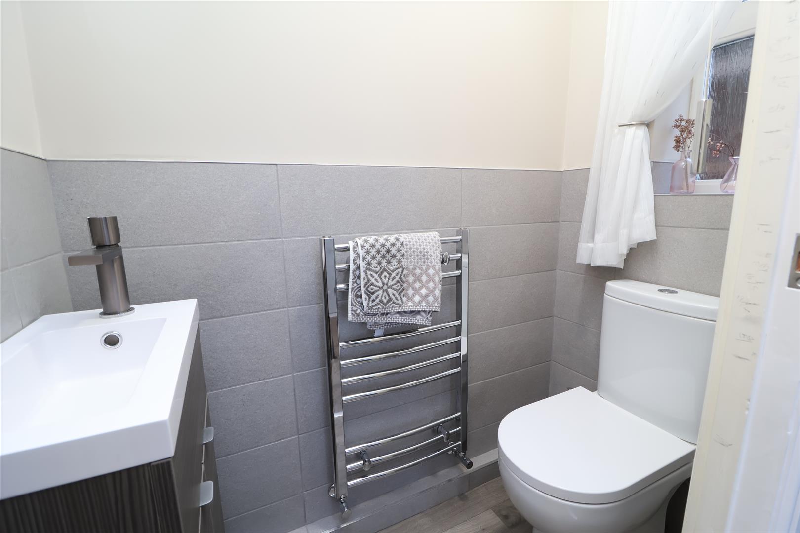 Downstairs W/C - Upvc obscure window to the side elevation, half tiled downstairs w/c which consists of; low flush w/c, vanity sink, chrome towel rail.