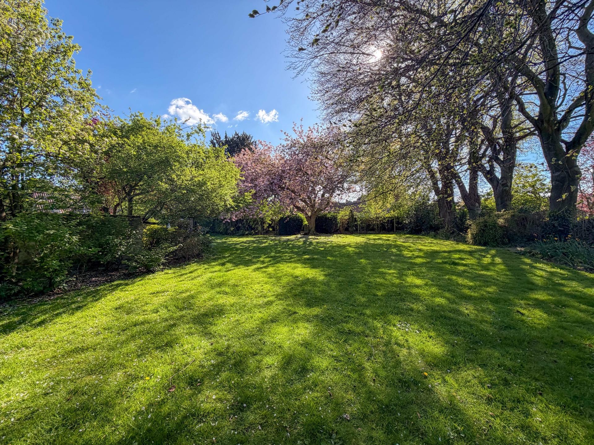 The grounds offer a mixture of lawned areas, pond, seating spots and space for outdoor living.