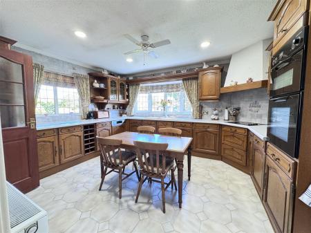 Kitchen - A spacious and practical kitchen featuring tiled flooring, two UPVC double glazed windows (front and side), a range of wall and base units, electric hob with extractor, and electric oven. Doors lead to the utility room, outside, and into the lounge diner.